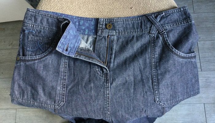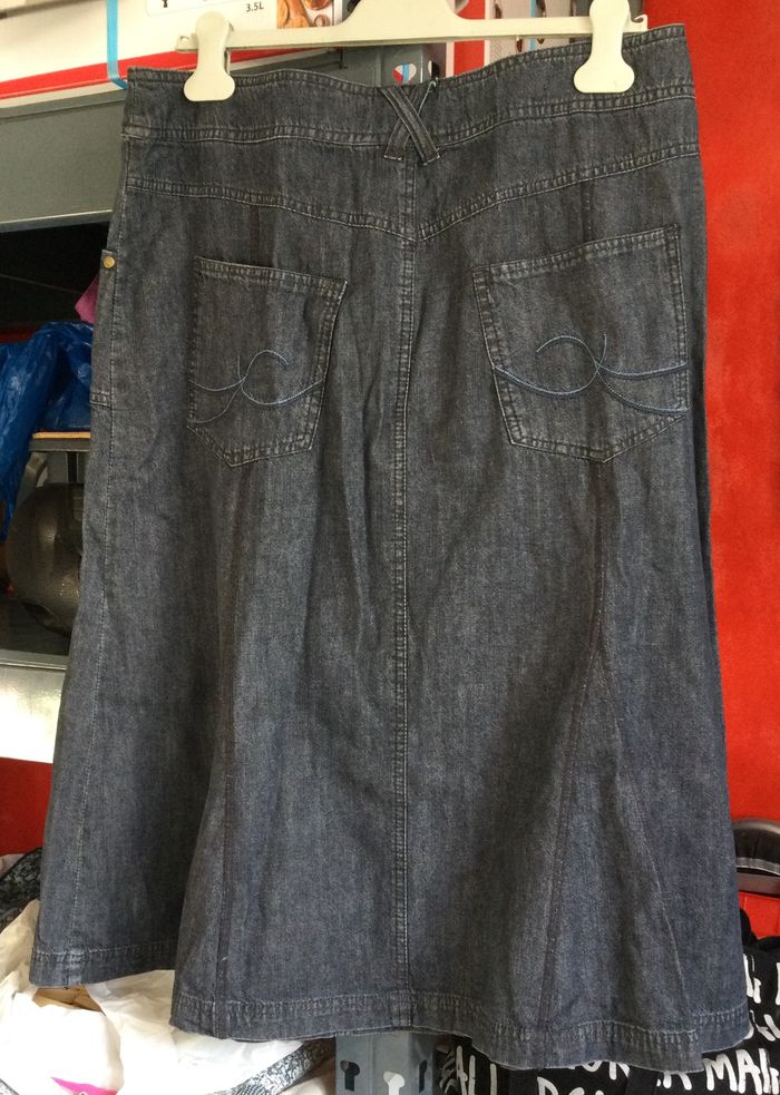 jupe jeans, sans marque, bleu, taille 42, 100%coton, 2 poches + 1 petite pochette à l'avant et 2 poches à l'arrière, fermeture éclair + 1 bouton à l'avant, passant pour une ceinture, largeur de la taille 46cm, longueur de la jupe 74cm. envoi rapide et soigné