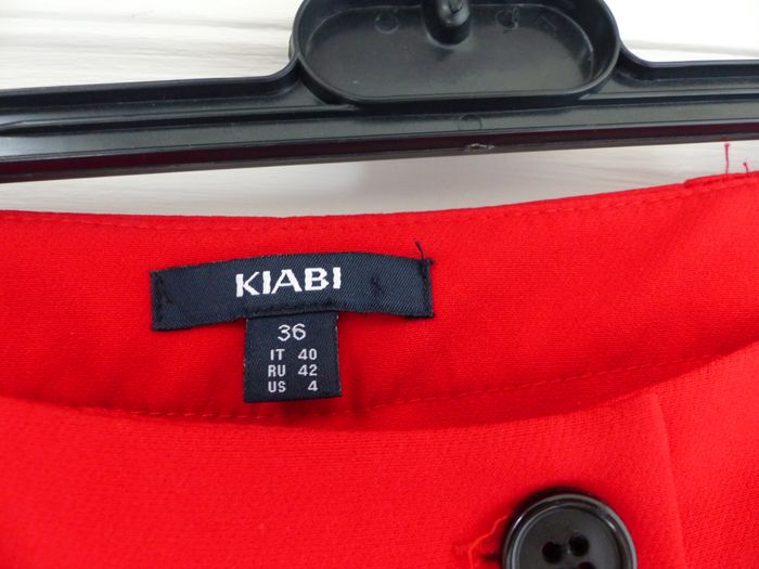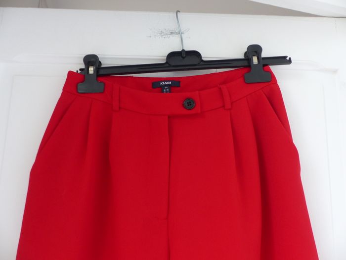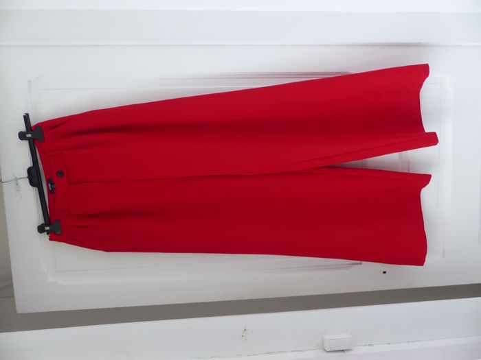 magnifique pantalon large en parfait état de demi-saison d'un très beau rouge belle coupe qui prend bien la taille et la marque bien tissu fluide très agréable à porter jambe large taille 36 marque Kiabi poche sur le coté invisible