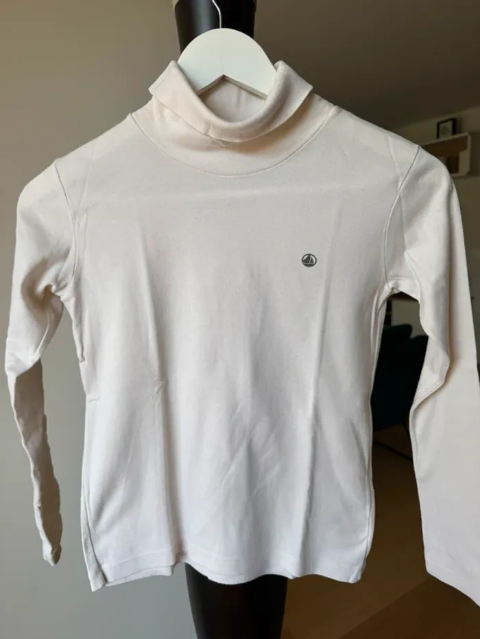 Bonjour, je vends un T-shirt à manches longues et un col roulé, en taille 10 ans, couleur crème, de marque Petit Bateau, en très bon état.