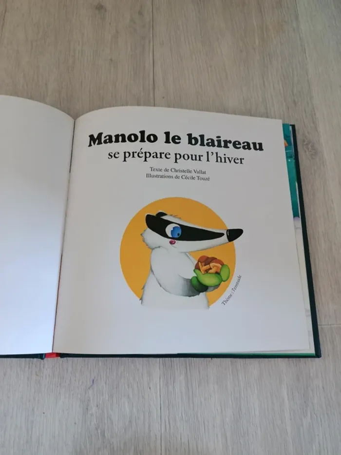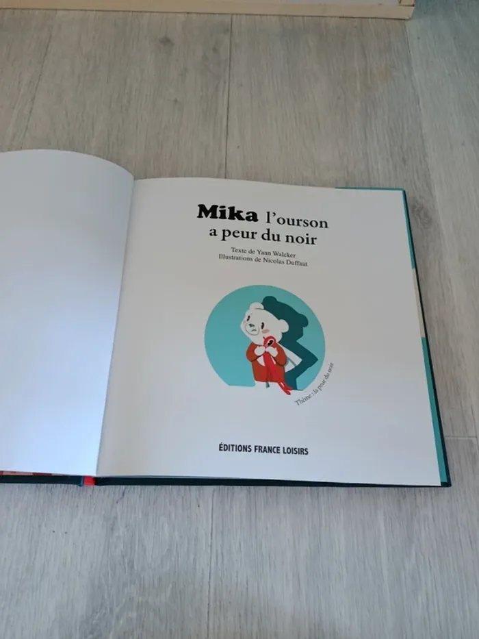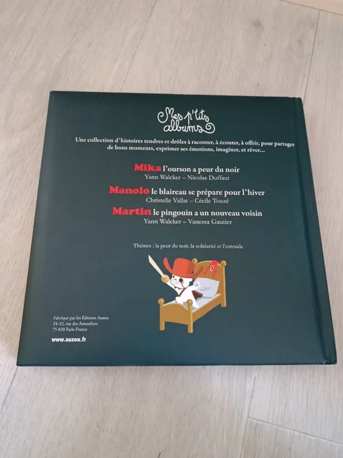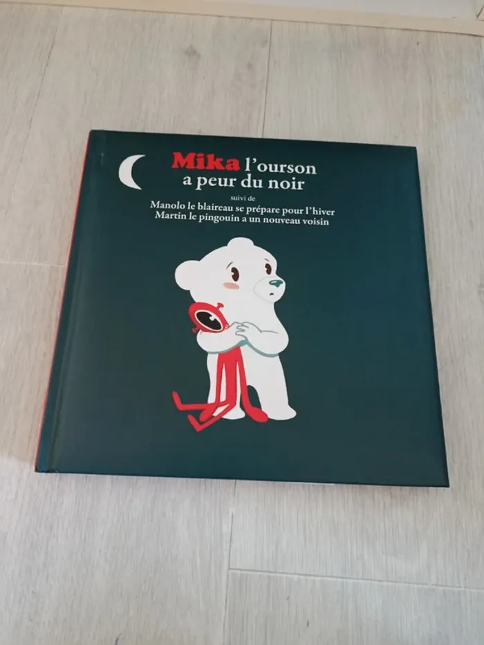 Livre avec 3 histoires : Sur le thème de : La peur du noir, la solidarité et l' entraide. Mika l'ourson a peur du noir Manolo le blaireau se prépare pour l'hiver Martin le pingouin a un nouveau voisin Le livre est en très bon état