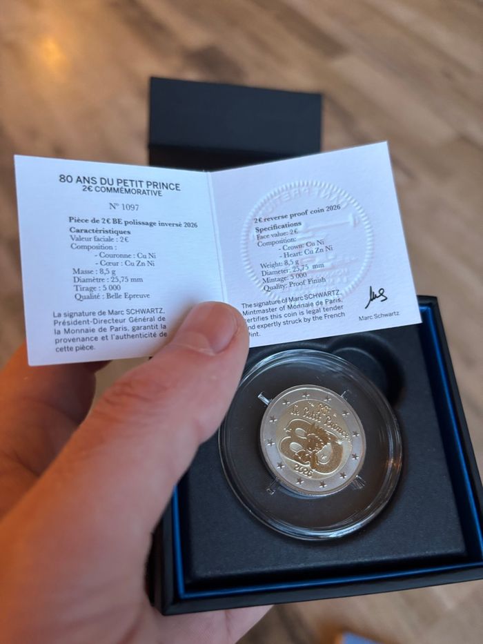 Réductions pour les abonnés ❤️ Je vends une pièce commémorative officielle de 2 euros “Le Petit Prince” – année 2026, émise par la Monnaie de Paris. 🔹 Polissage inversé (finition haut de gamme, très recherchée) 🔹 Qualité BE (Belle Épreuve) 🔹 Édition strictement limitée à 5 000 exemplaires 🔹 État neuf, jamais circulée 🔹 Vendue avec son coffret officiel illustré + enveloppe Monnaie de Paris 🔹 Diamètre 25,75 mm 📦 Envoi rapide et ultra soigné ❌ Pas d’échange