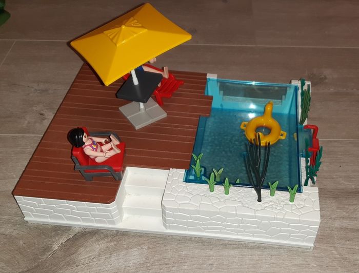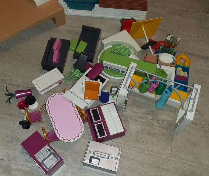 Maison moderne Playmobil Comprenant la  Maison, le studio des invités et la piscine Pas de boîte Pas de notice (Possibilité de la trouver sur internet) Vendue avec tous les accessoires et personnages sur les photos : tables,  chaises,lit, dressing, douche, fauteuil...... La sonnette fonctionne Manque quelques éléments du toit, manque un tiroir du dressing et quelques plantes (voir photos) Barbecue offert mais pas de la marque Playmobil Très bon état