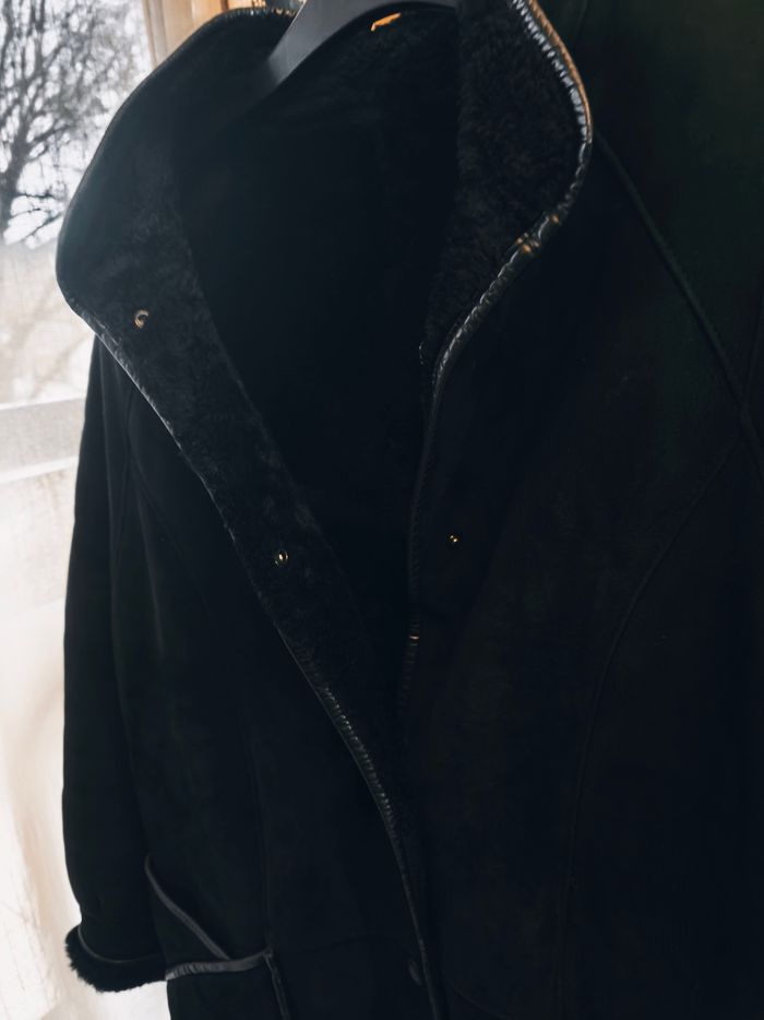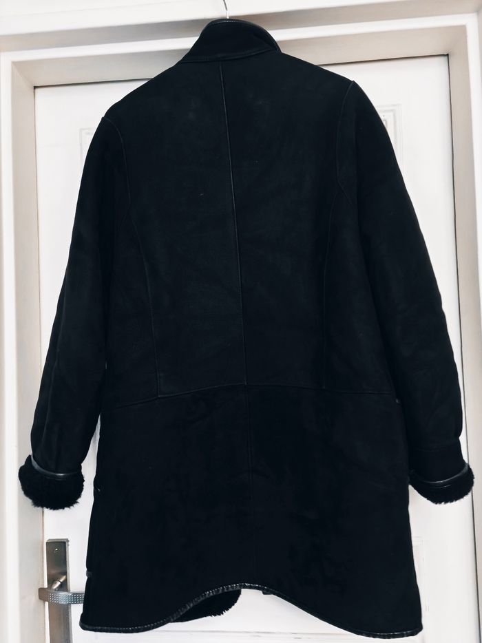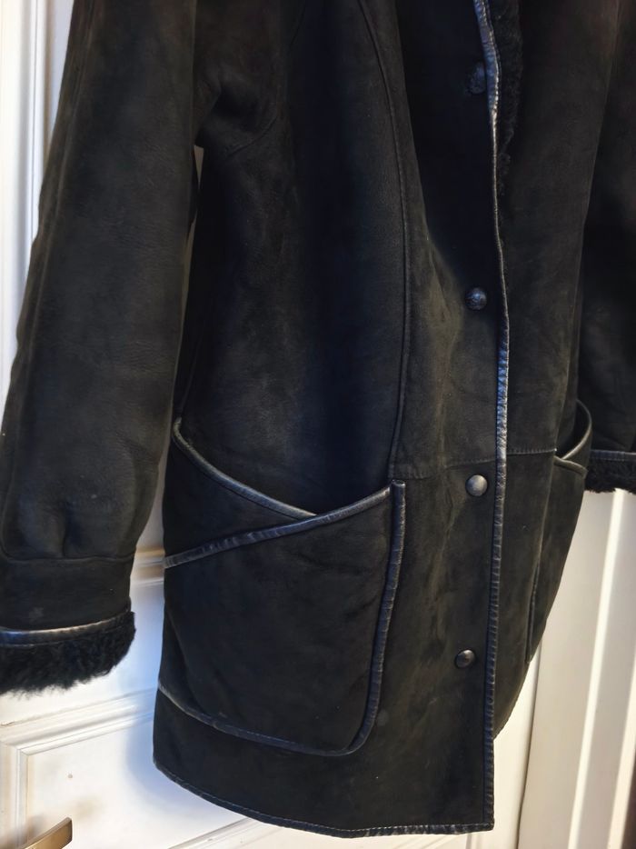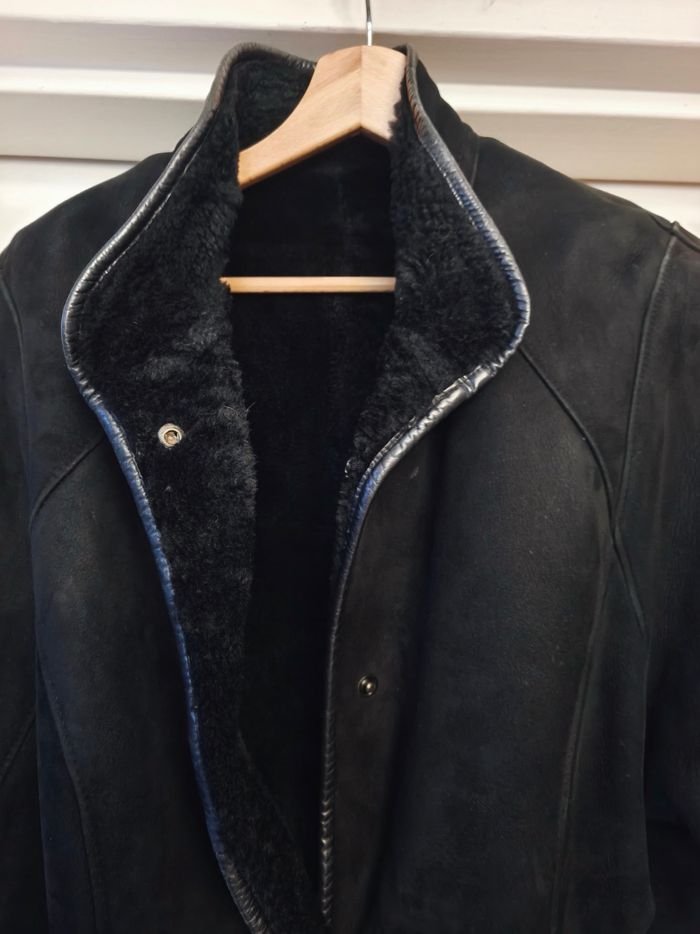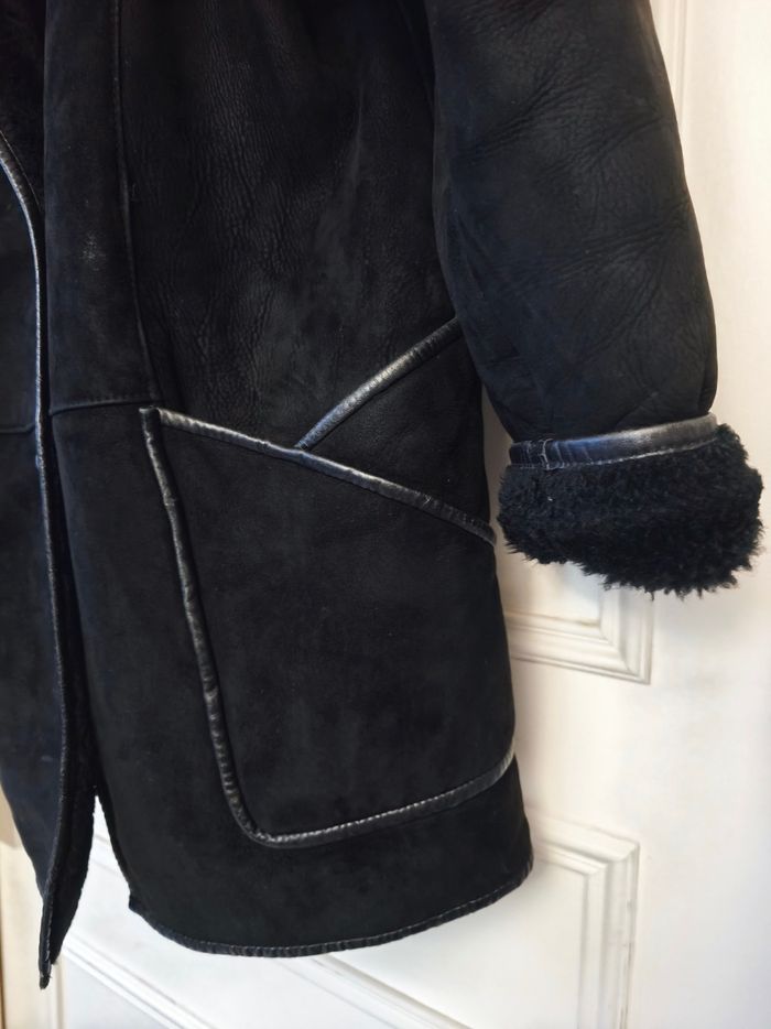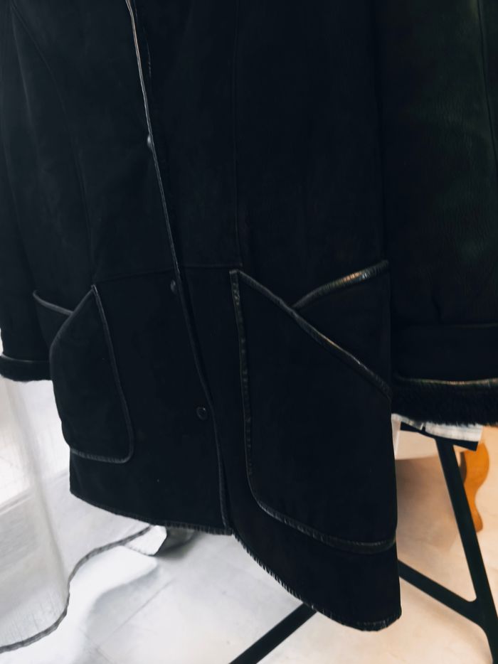Manteau en peau lainée véritable (shearling) de la marque Reginapary, Fabriqué en France 🇫🇷 – qualité et savoir-faire haut de gamme. Extérieur en cuir suédé noir, intérieur entièrement doublé en laine naturelle, très chaud et confortable. Détails : - Coupe droite, intemporelle - Col montant avec laine apparente - Fermeture par boutons-pression - Deux grandes poches sur le devant - Finitions soignées