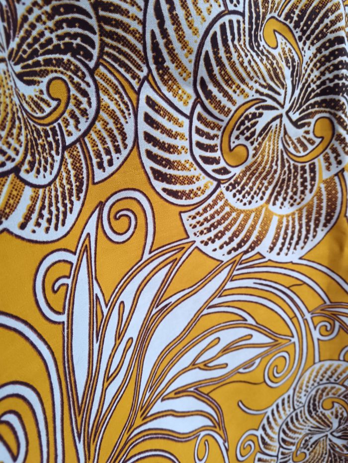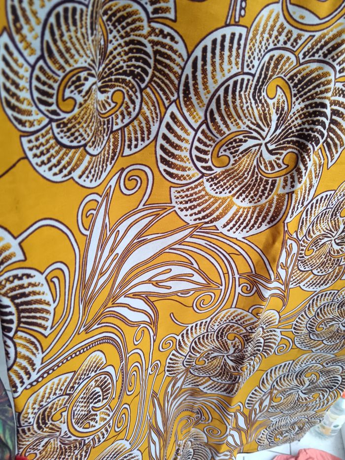 100 % coton Amagatewax 2 yard soit 180 cm x 115 Il est plus moutarde et bleu ciel même si sur la photo ça paraît blanc..