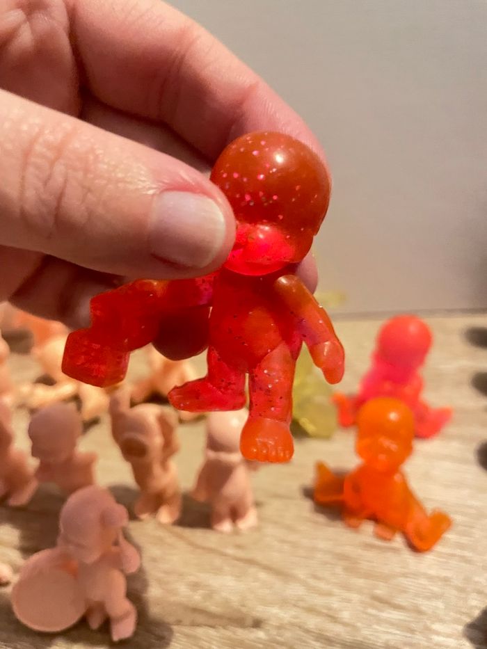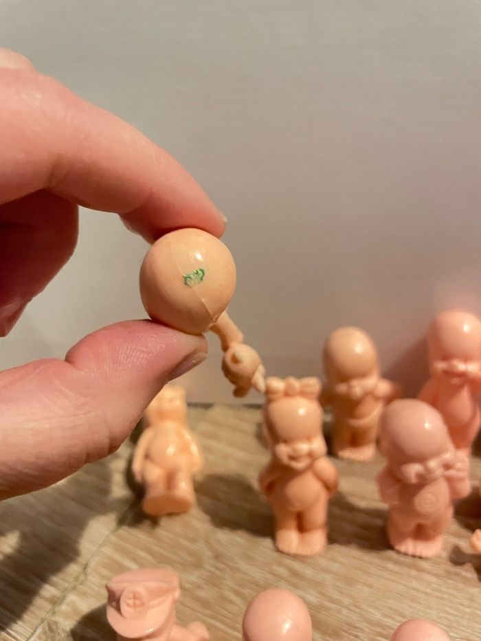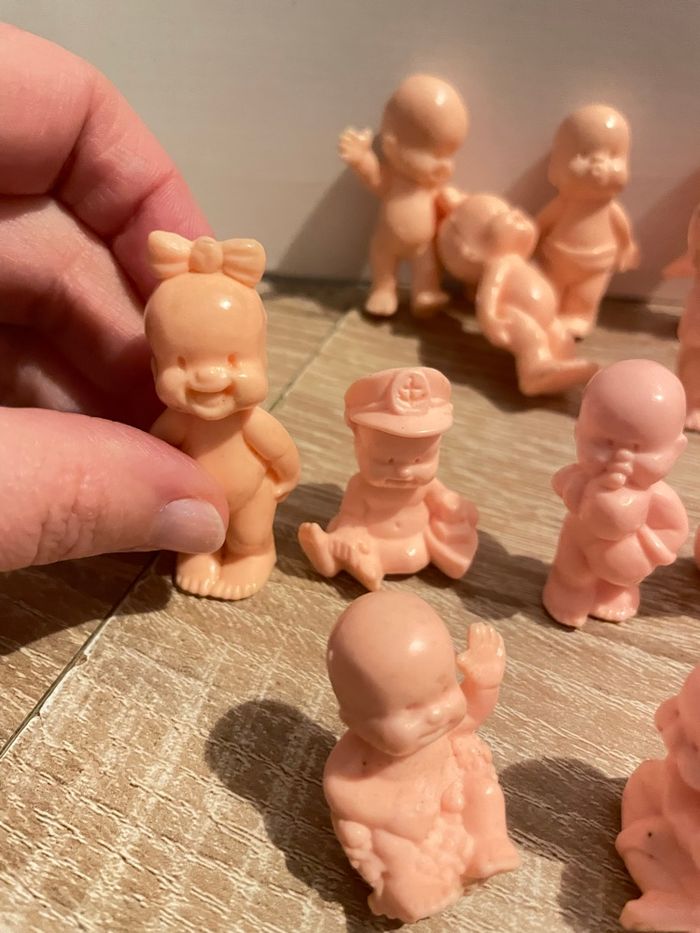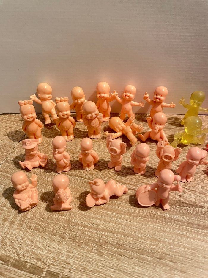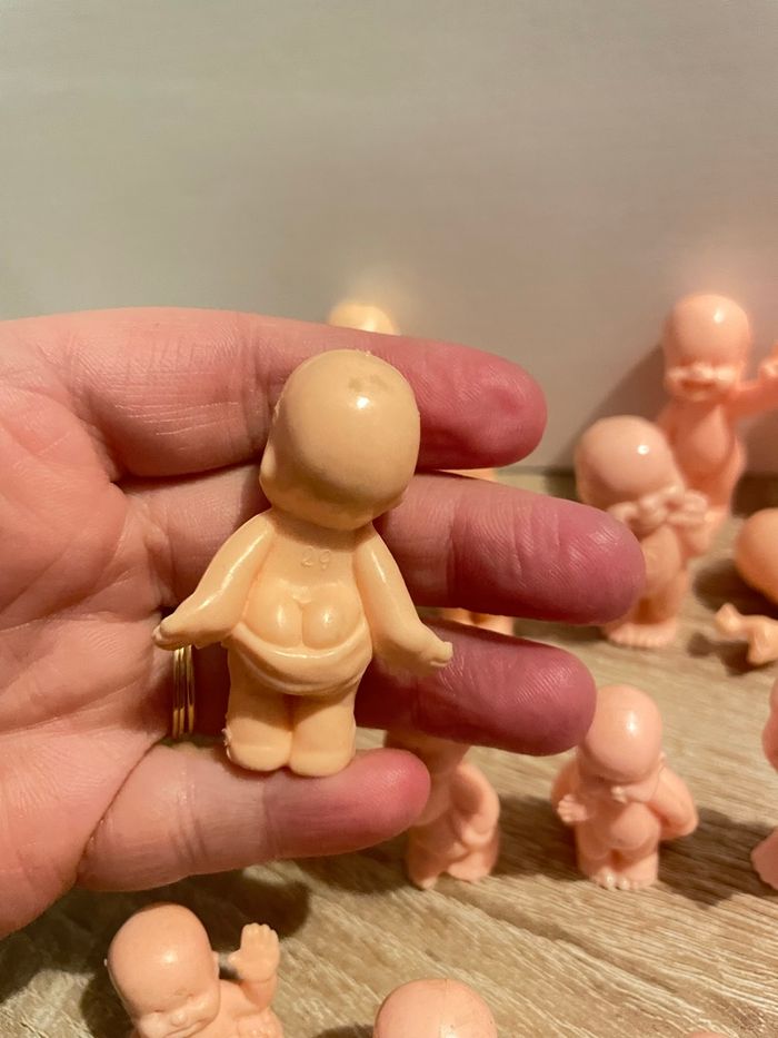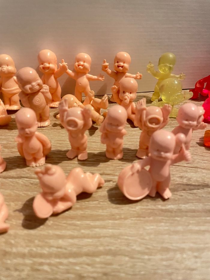 Lot de 34 babies Bon état général (présence de trace sur certains chairs) seront à nettoyer par vos soins. Des couleurs, des transparents pailletés ou non et des chairs. Dans les couleurs chairs il y a des petits et des standards. Quelques doubles. Lot non dissociable.