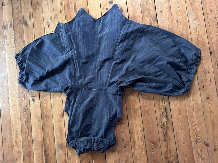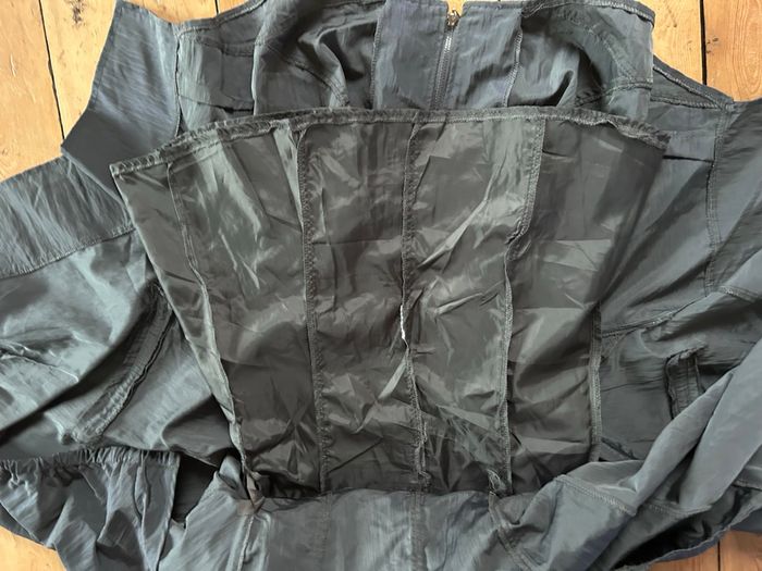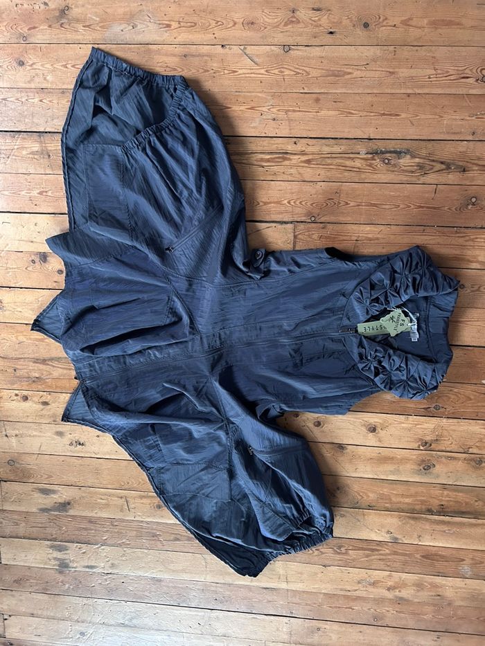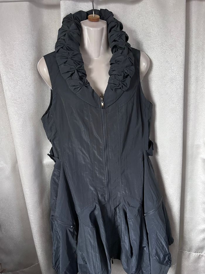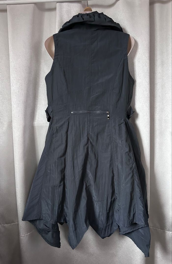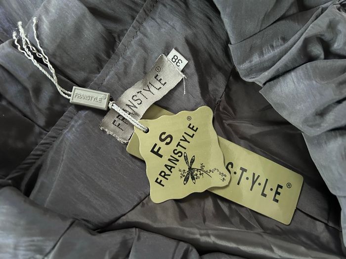 Robe neuve gris bleu Grande fermeture devant, s’ouvre entièrement et dans les 2 sens. Pas de poche. Entièrement doublée Jupe asymétrique Taille 38 100% polyester Et 85% polyester 15% polyamide Fs Franstyle Carrure 36,5 cm Aisselle à aisselle 49,7 cm Taille à plat au dessus des petites pattes boutons 44,5 cm Longueur jusqu’au pointes 102 cm