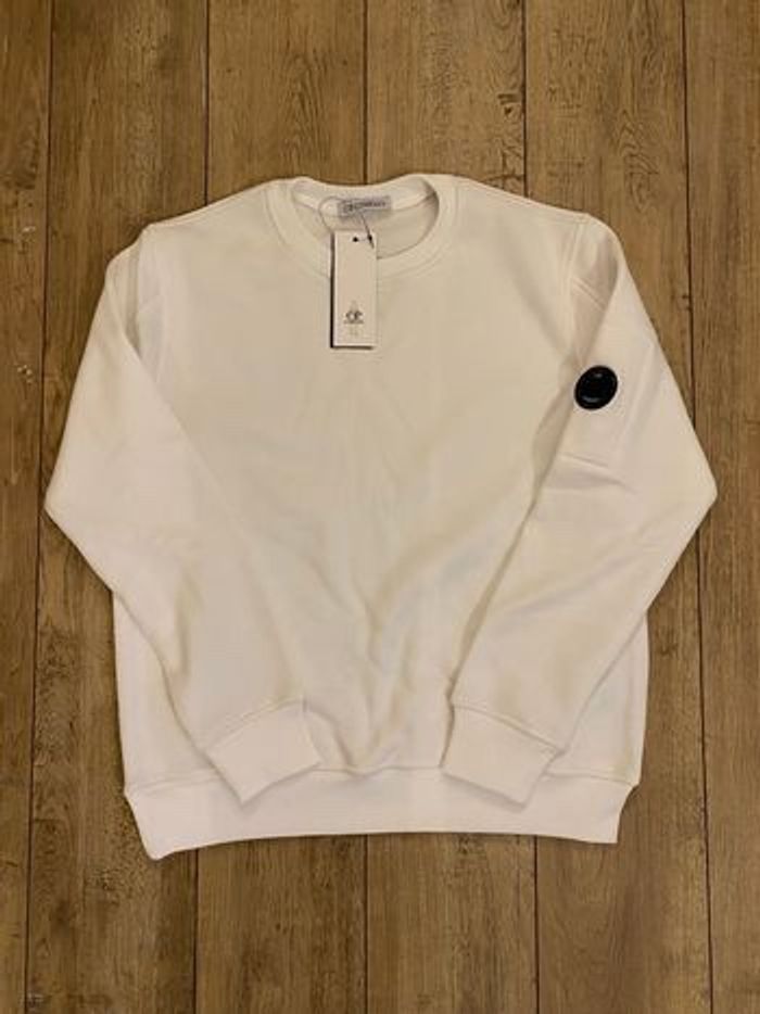 Pull sweat-shirt blanc C.P. Company taille L Coupe droite Aspect uni Col rond Manches longues Col, poignets et ourlet côtelés Badge et poche sur la manche. Doublé de polaire pour l’hiver. Longueur : 67 cm Largeur entre les aisselles : 58 cm