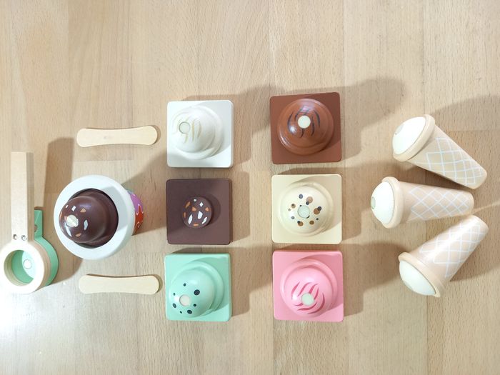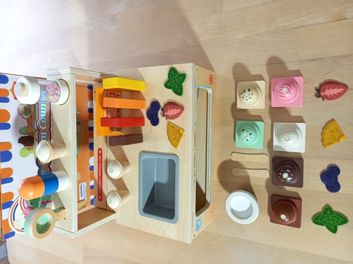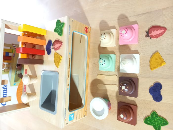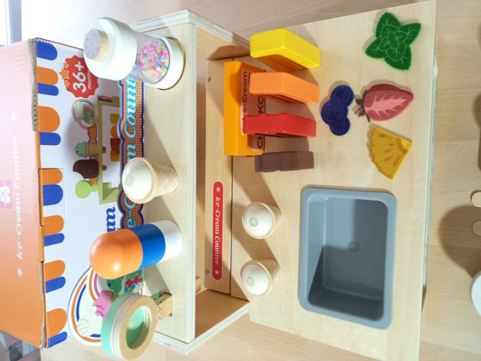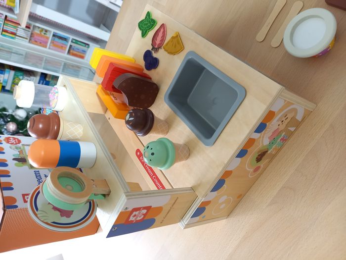 Adorable marchand de glace en bois. Une expérience de jeu complète avec ce kit complet et bien garni! ​🍦 🔍​ Description: ✨ Etat: Jamais utilisé, sorti de l'emballage uniquement pour prendre les photos ✨​ Style: Jeu d'imitation ✨​ Thème: Coordination main-œil / motricité fine / imagination ✨​ Age: Dès 3 ans Autres jouets d'inspiration Montessori disponibles! ⚠️ Il ne s'agit pas de la marque Montessori mais d'un jeu s'inspirant de cette pédagogie. ​​🍨 ​Comptoir à crèmes glacées pliable et grand espace de rangement : Offrez à votre enfant une expérience de jeu d'imagination captivante! Son design innovant pliable avec rangement intégré facilite le nettoyage et permet de gagner de l'espace lorsqu'il n'est pas utilisé, en gardant l'aire de jeu organisée. 🍧 Ensemble de jeu complet de 52 pièces: Tout ce dont votre enfant a besoin pour gérer un magasin de glaces se trouve ici ! Ce jeu de rôle comprend une belle variété de boules de glace en bois, de glaces colorées, de cornets, de toppings délicieux, un menu pratique et de la monnaie fictive réaliste pour des heures de jeu immersif et créatif. 🌳 Construction durable et sûre pour les enfants: Conçu pour durer, ce kit est fabriqué en bois naturel massif de haute qualité et recouvert de peinture à l'eau. 🧵 Jeu créatif et imaginatif: Plus qu'un simple jouet, il s'agit d'un outil éducatif. Il encourage la narration imaginative tout en aidant les tout-petits à développer la motricité fine, la coordination main-œil, la reconnaissance des couleurs et des formes, ainsi que les concepts mathématiques de base à travers le comptage et l'échange de monnaie factice. 🔍 Allez regarder mon dressing, nombreux jeux de société et jouets pour enfants disponibles ou en cours de publication. Abonnez-vous :) 🚚 Pour une expédition (et une livraison) rapide, merci de privilégier Mondial Relay ou Colissimo
