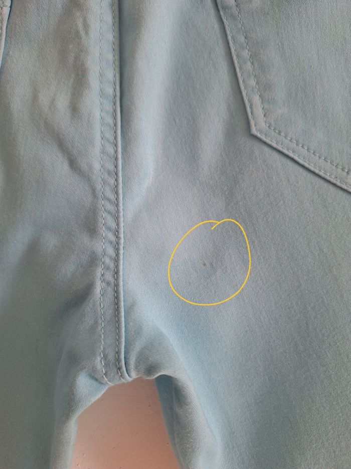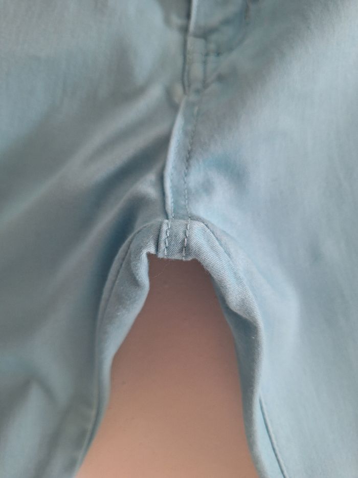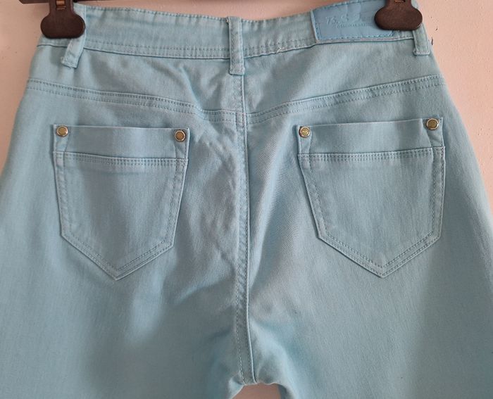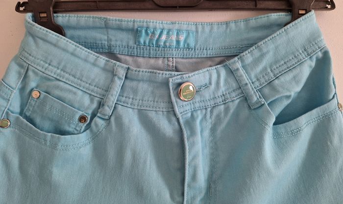 Joli pantacourt turquoise. Passants pour ceinture. Poches devant et derrière. Beau bouton de fermeture et rivets assortis. En coton, polyester et élasthanne. Toute petite tâche derrière et écusson de la marque un peu craquelé. Entrejambe nickel.