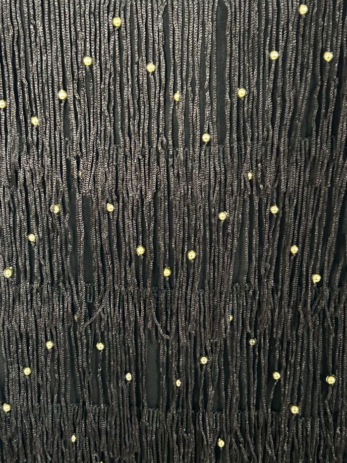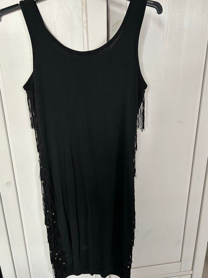 robe à franges sans manches, noire style charleston. Taille XS de la marque « K woman » Devant à franges et perle argenté. Derrière uni Matière souple et extensible. En très bon état.