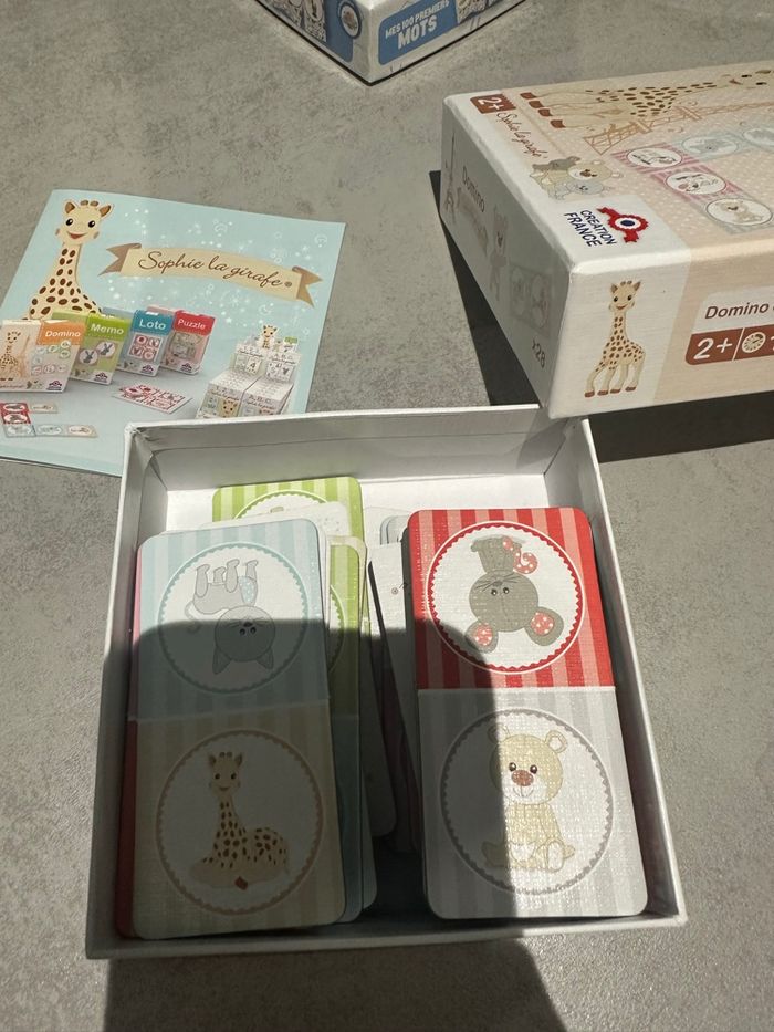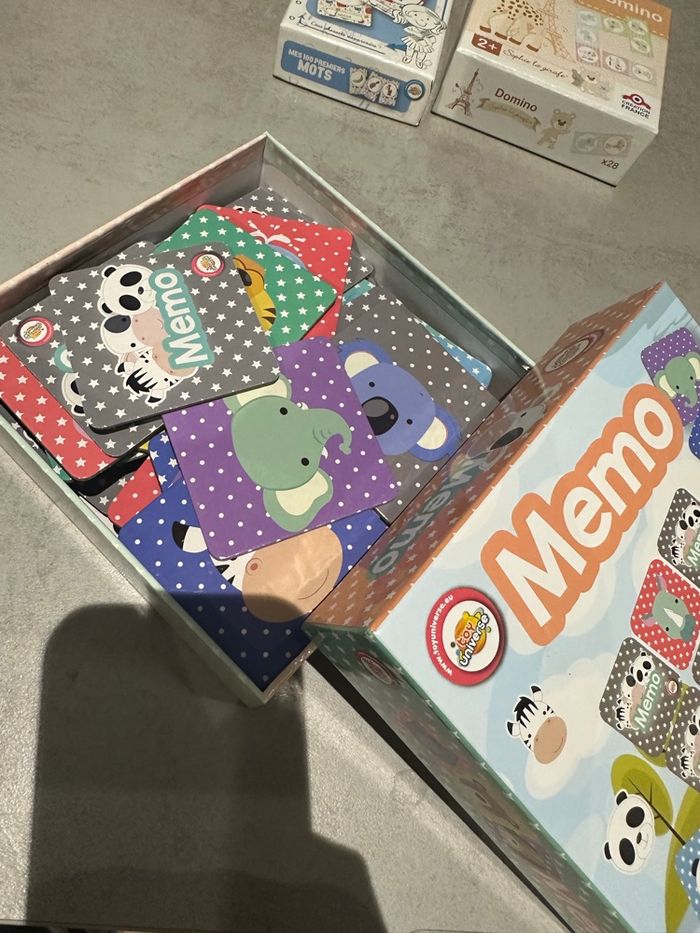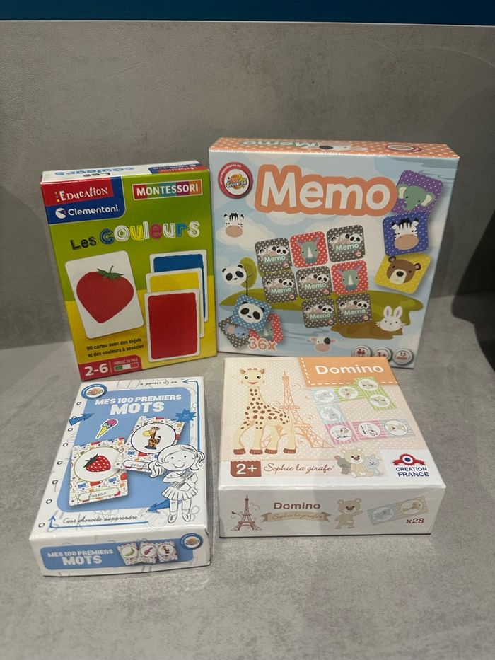 Lot de 4 jeux. Le tout en très bon état. Domino neuf Mémo neuf Les couleurs complet Les 100 premiers mots il manque 6 cartes.
