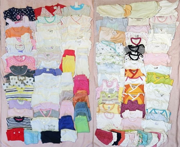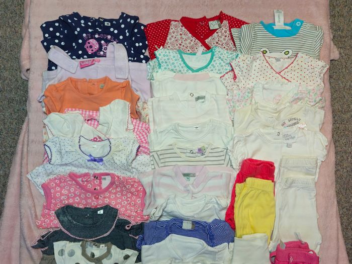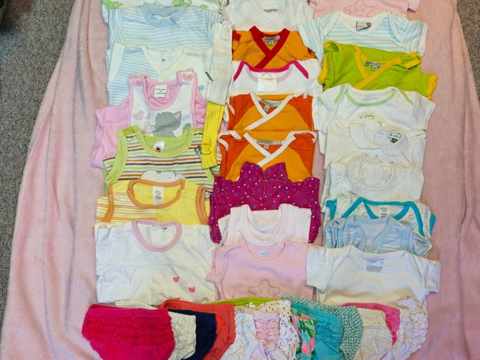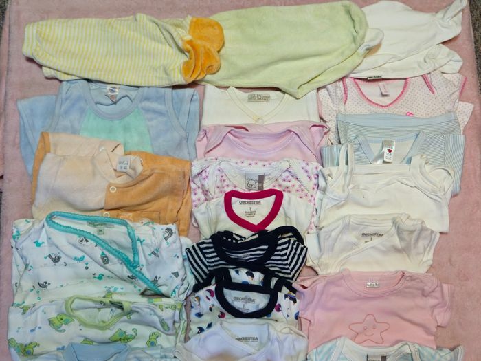 Très gros lot de vêtements bébé filles de 0 à 3 mois. Body, pyjama, t-shirt, pantalons, robes, etc. 3-4 pièces ont le blanc plus tout à fait blanc (voir exemple en photo). Parfait pour des parents au petit budget. Orchestra, C&A, Prémaman, etc. dans le lot