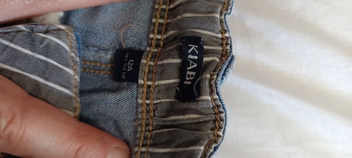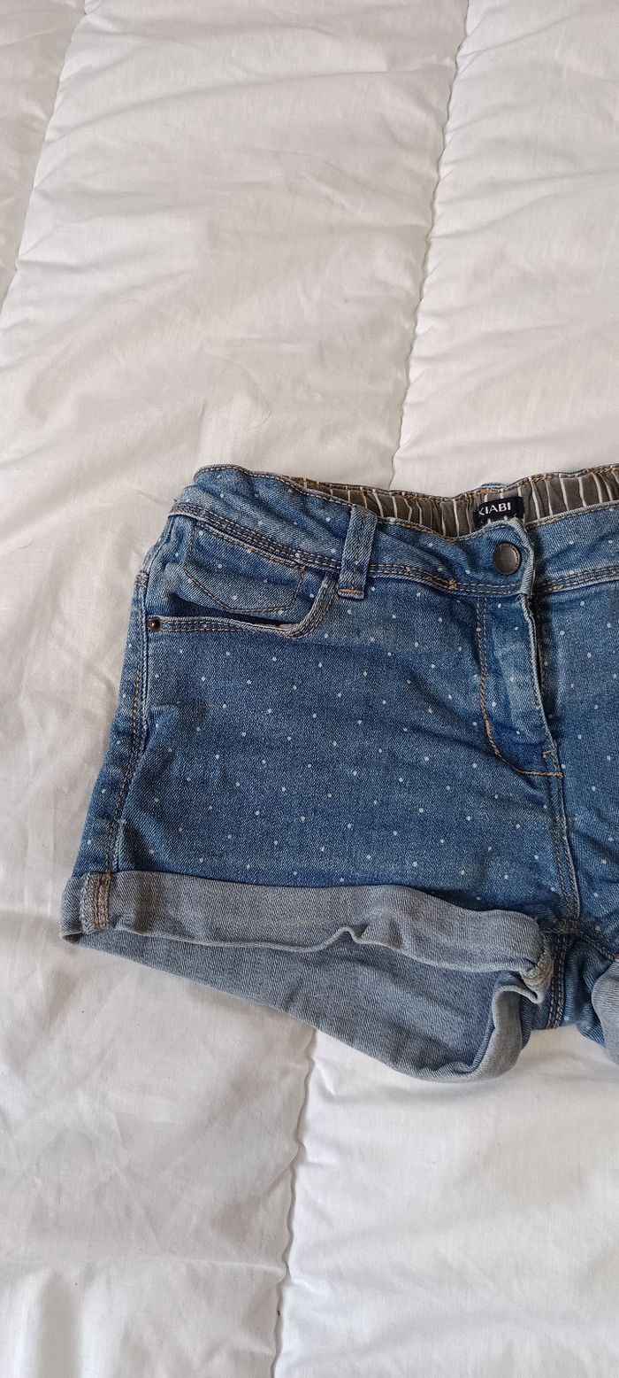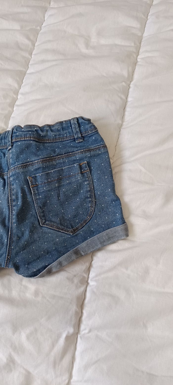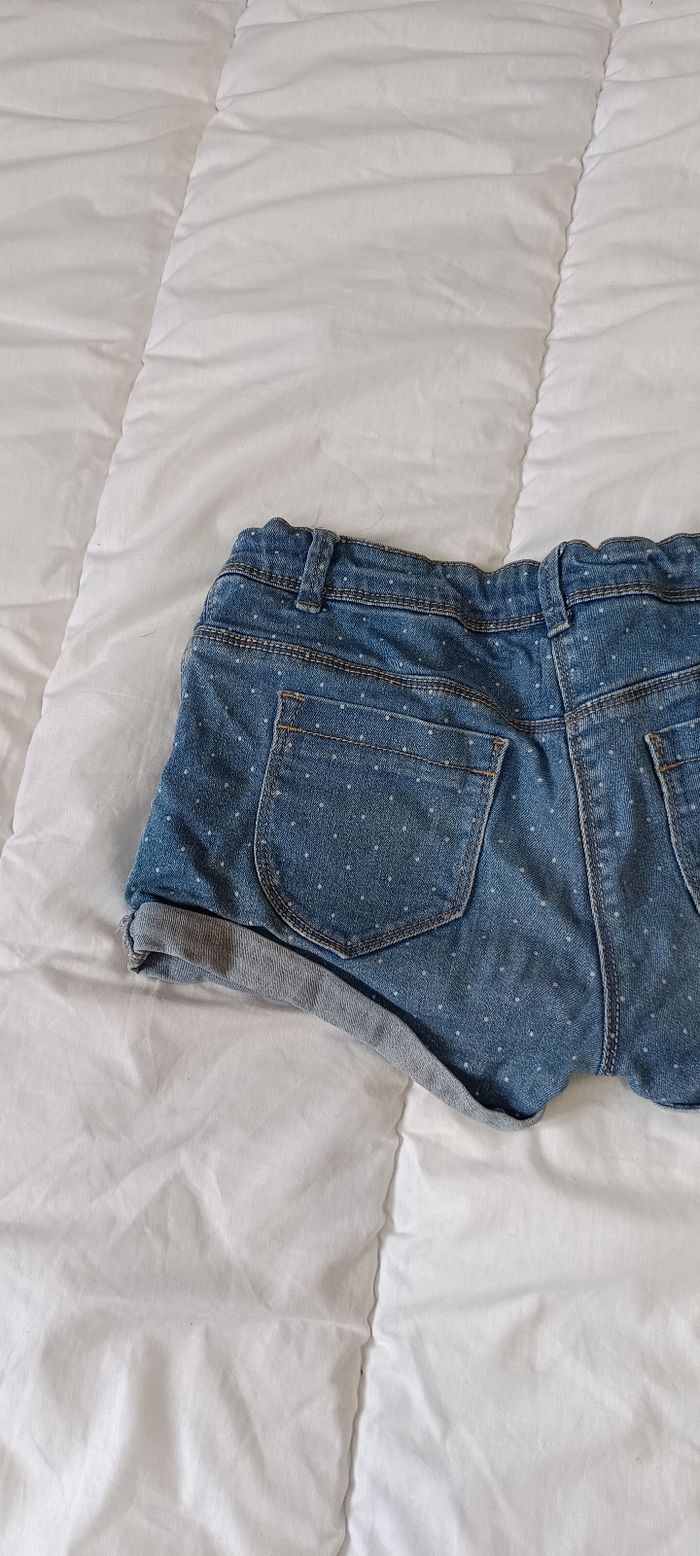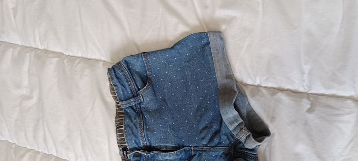 Short en jean coloris bleu avec pois blanc Fermeture éclair et pression Réglable à la taille Taille 12 ans de chez Kiabi Bon état - ni trou ni tâche