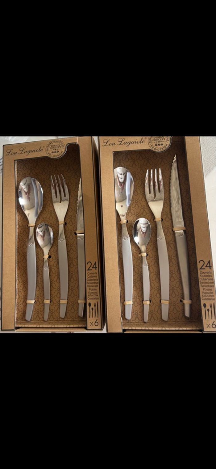 Je vends cette ménagère de 24 couverts en acier inoxydable de la marque Laguiole. Finition, mat • Type de produit : Ménagère 24 couverts • Marque : Laguiole • Composition du lot : 6 fourchettes, 6 couteaux, 6 cuillères à soupe, 6 cuillères à café • Finition : Miroir • Accessoires inclus : Coffret de rangement État neuf Le coffret 24 pièces 37 € ou bien les deux coffrets, 48 pièces pour 65 € état neuf.