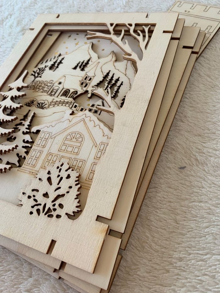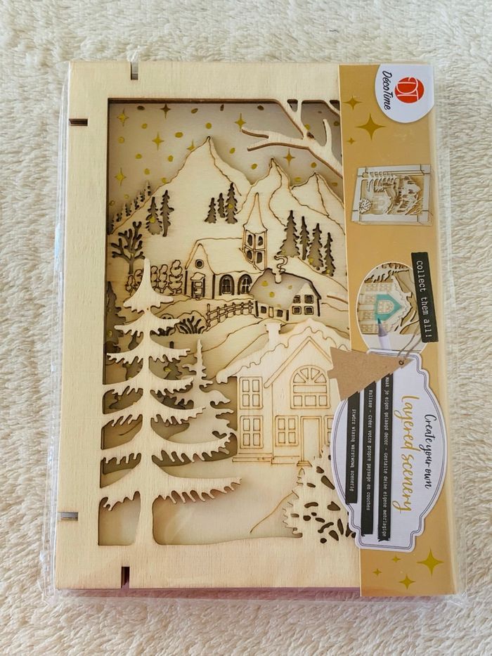 Kit en bois paysages d'hiver Decotime Décoration à monter soi-même L'ensemble comprend un socle spécial sur lequel sont ensuite placés les différents éléments pour créer une image en 3D. L'image peut être conservée telle quelle ou peinte/colorée, par exemple avec des feutres, de la peinture, ou décorée avec d'autres matériaux. Dimensions : 14,8 cm x 21 cm Complet Neuf, sans utilisation  ⛔️ Prix FIXES, NON négociables 🚨  👏🏻 Réductions sur les lots 👍🏻 #cadre3D #kitensemblage #Kitenbois #scrapbooking #loisirscreatifs