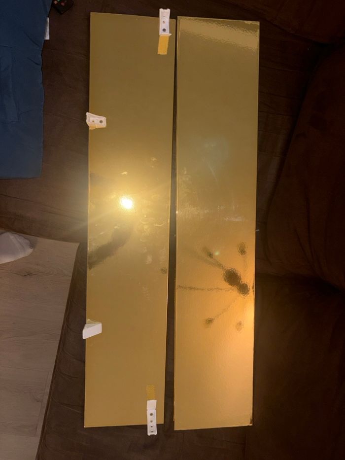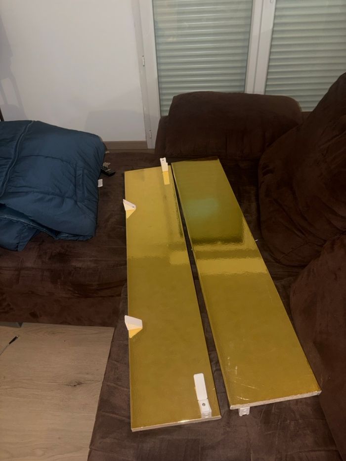 Lot de 2 étagères murales décoratives, finition dorée brillante / effet laqué. Design moderne, idéal pour salon, chambre, entrée ou bureau. • 📏 Format rectangulaire allongé • 🧱 Fixations incluses (voir photos) • 🎨 Couleur : doré / or • 🪵 Matière : panneau rigide avec revêtement brillant • 🔧 Montage mural facile 👉 Vente en lot privilégiée, mais possibilité d’en vendre une seule → me contacter par message