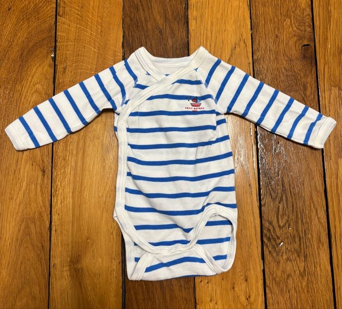 Kit naissance / nouveau-né Petit Bateau idéal pour la valise de maternité. Ensemble complet et cohérent comprenant bodies, pyjamas et bonnet, parfaitement adaptés aux tout premiers jours de bébé. ⸻ Description détaillée : • Taille : 1 mois – 54 cm (taille indiquée sur les étiquettes) • Marque : Petit Bateau • Contenu du lot : • 3 bodies manches longues croisés • 2 pyjamas une pièce • 1 bonnet naissance • Matières : 100 % coton pour l’ensemble du lot sauf 1 pyjama en coton/modal (voir étiquette en photo) • Coloris et motifs : • Bodies à motifs marins, étoiles/animaux et rayures • Pyjamas rayés bleu/blanc et gris à petites étoiles • Bonnet écru ⸻ Caractéristiques : • Bodies à ouverture croisée cache-coeur, parfaitement adaptés aux nouveau-nés • Boutons-pression pour un habillage et un change faciles • Pyjamas confortables, doux et respirants • Bonnet naissance inclus, indispensable pour la maternité • Lot pensé comme un kit naissance prêt à l’emploi ⸻ État : • Excellent état • Aucun trou, aucune tache • Pressions parfaitement fonctionnelles • Très peu porté ⸻ Maison non-fumeur et sans animaux.