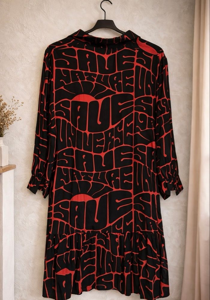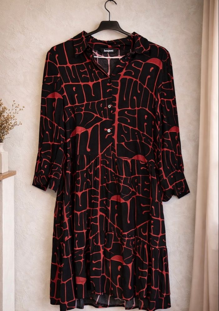 Robe qui s’attache à l’aide de boutons à l’avant. Manches 3/4 qui possèdent deux boutons chacune. Très peu portée
