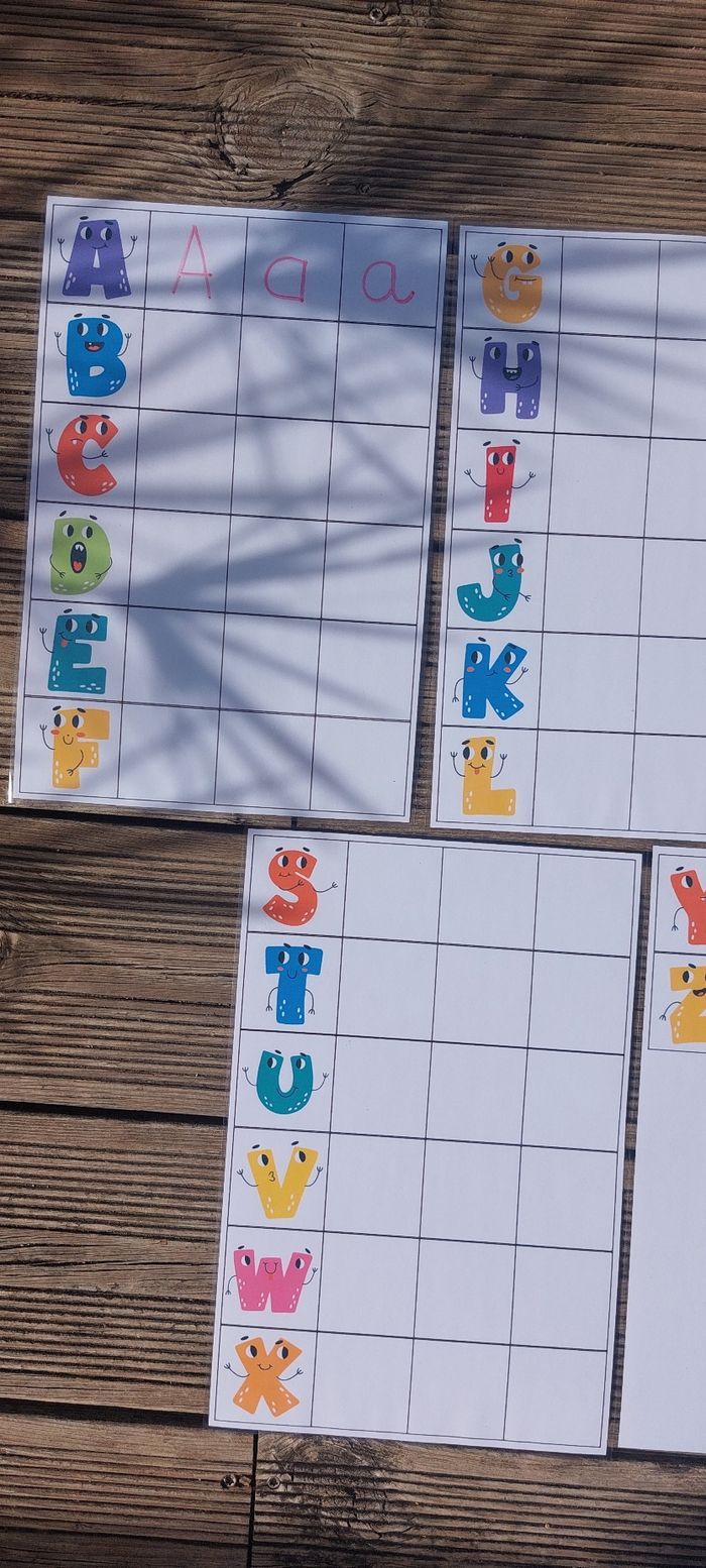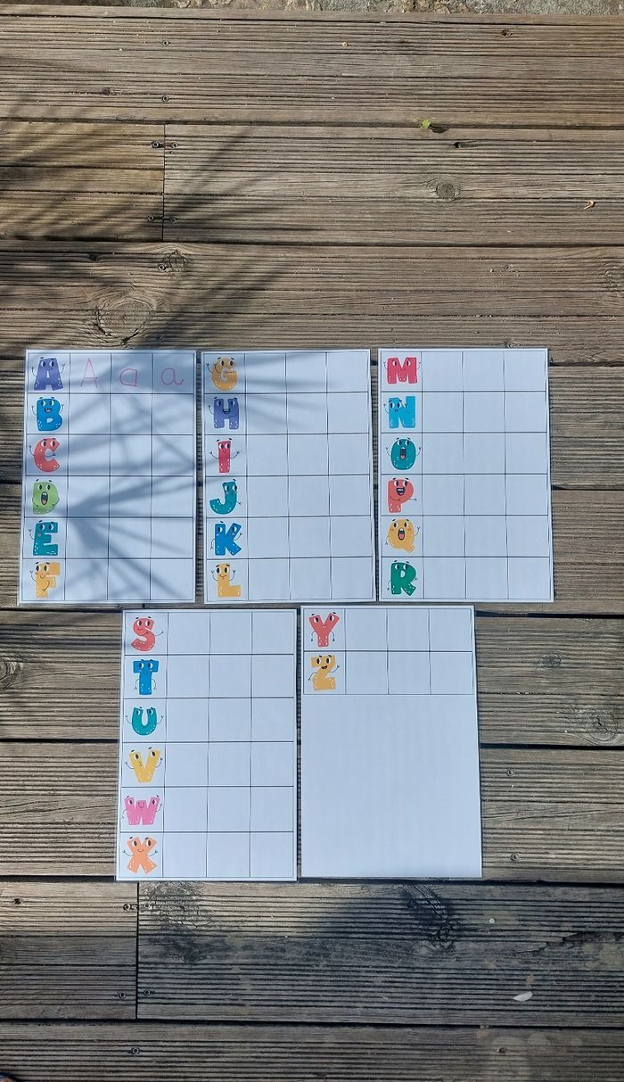 5 affiches imprimées et plastifiées Format A4 Fait main Apprendre à écrire l'alphabe avec un feutre effaçable 3 cases blanches pour écrire en lettres majuscules, en minuscules, en cursives. #maternelle #apprentissageludique #faitmain #lecture #ecriture #cp