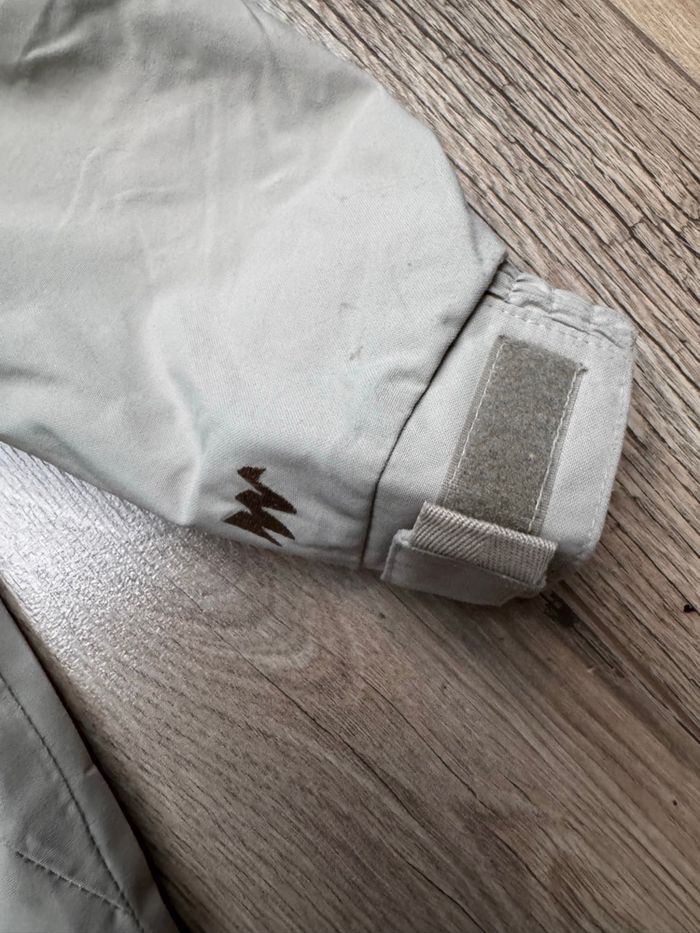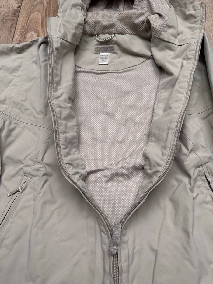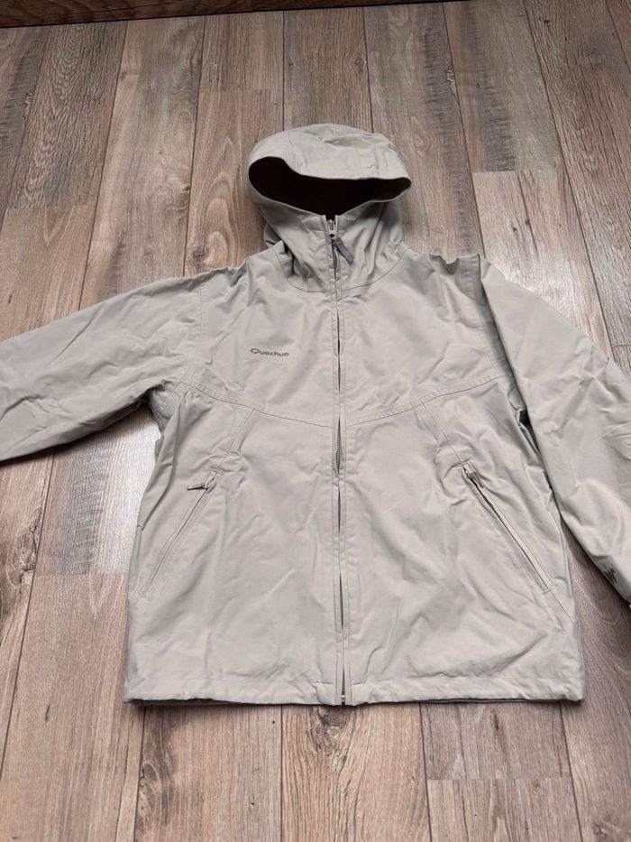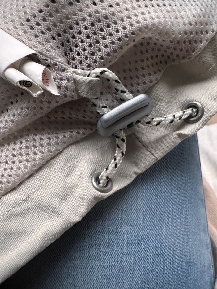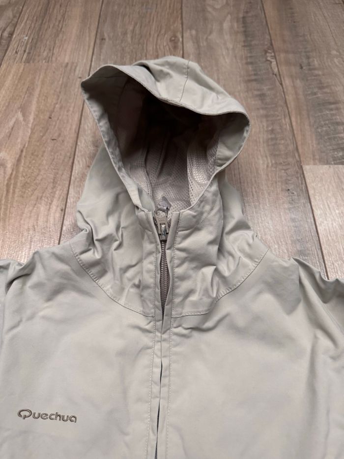 Blouson Décathlon 10 ans type kway à capuche de couleur beige sable 2 poches sur les côtés avec fermeture éclair Fermeture éclair sur le devant Peut être resserré en bas CLR2
