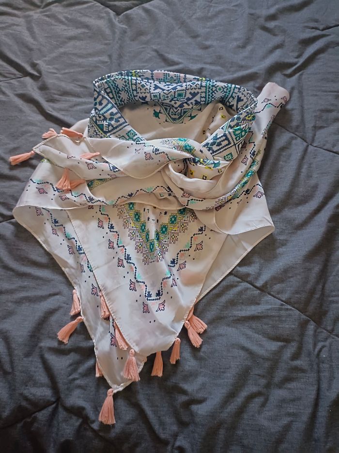Grand foulard carré en soie et viscose, dimensions 110x110cm. Très bon état.