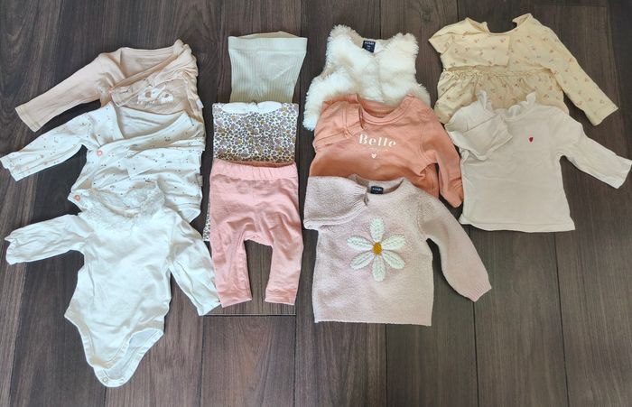 A vendre lot bébé fille 1 mois. Toute les pièces ont été achetés courant du mois de janvier, comme neuf. Marque kiabi