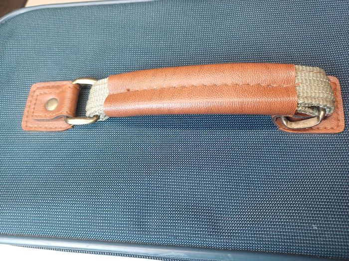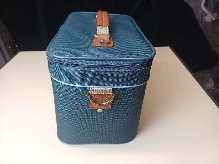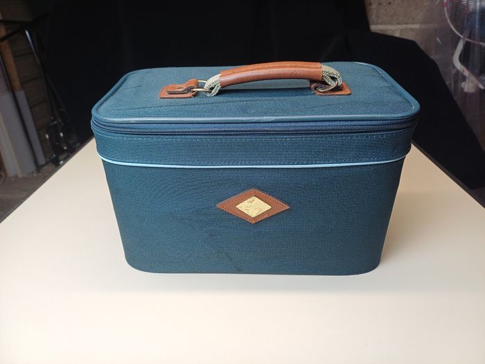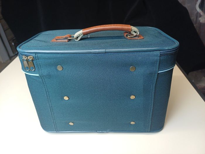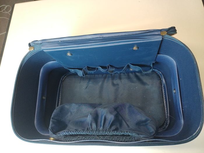 vanity case vintage d'une jolie couleur bleu canard / pétrole. Parfait pour ranger votre maquillage, vos produits de beauté ou même pour servir de valise cabine rétro lors de vos week-ends. ​Design : Look rétro avec finitions en simili-cuir marron et détails dorés. ​Praticité : * Grande capacité de rangement. ​Miroir intégré sous le couvercle (très pratique pour se préparer en voyage !). ​Plusieurs compartiments élastiqués à l'intérieur pour maintenir vos flacons droits. ​Poche intérieure amovible. ​Poignée robuste et attaches latérales pour ajouter une bandoulière (non fournie). ​Picots de protection sous le sac pour éviter de l'abîmer en le posant. ​État : Bon état général pour du vintage. À noter quelques légères traces d'usage sur le tissu et quelques rayures sur le logo doré à l'avant (voir photos), ce qui lui donne tout son cachet authentique. L'intérieur est propre. ​Idéal pour les amateurs de mode vintage ou pour un cadeau original !