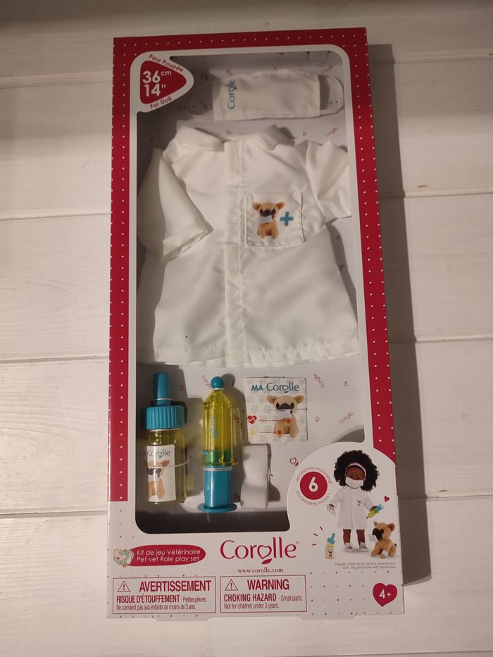kit vétérinaire de la marque Corolle envoi rapide et soigné Le kit de jeu parfait pour jouer au vétérinaire pour poupée ma Corolle 36 cm. 6 accessoires pour équiper la poupée et soigner les animaux : 1 masque chirurgical, 1 blouse avec un vraie poche, 1 seringue, 1 flacon de médicaments, 1 bandage et 1 carnet de vaccins.