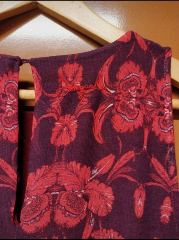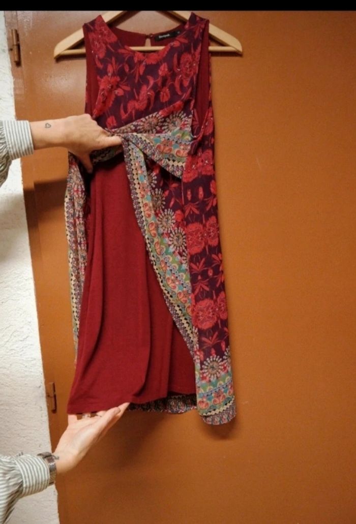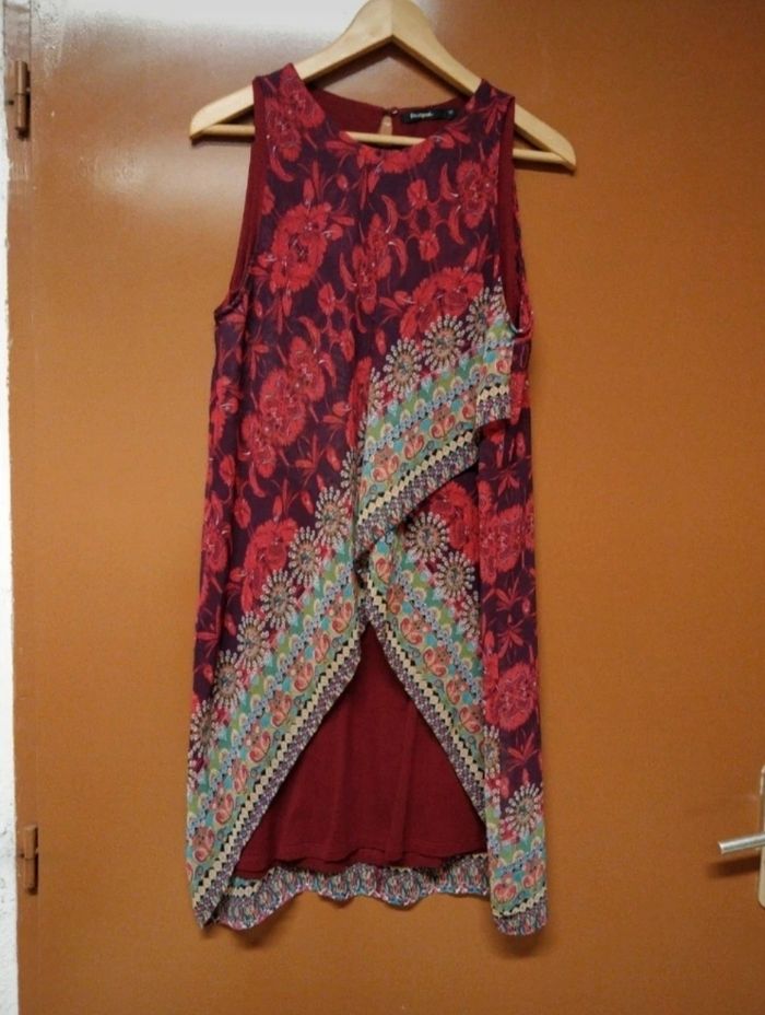 Superbe robe sans manches de la marque Desigual. Un modèle original et fluide, parfait pour une tenue à la fois décontractée et élégante. Magnifique imprimé floral et mandalas dans les tons bordeaux, rouge et turquoise. ​Coupe originale : Effet "double épaisseur" avec un pan de tissu asymétrique croisé sur le devant qui apporte beaucoup de mouvement. ​Taille : 36 (S). ​État : En parfait état, comme neuve.