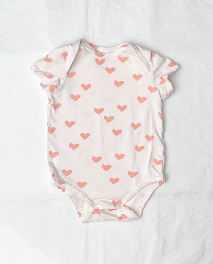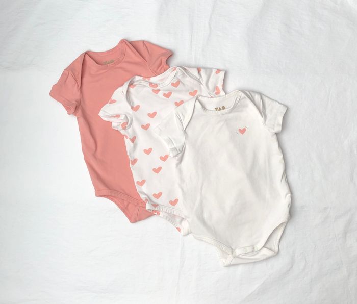 Lot de trois bodies Tape à l’œil, Taille 6 mois/ 68 cm, En coton/ élasthanne, Manches courtes. -un body écru avec un petit cœur rose et des paillettes dorées, -un body blanc avec des cœurs roses, -un body rose uni. Ensemble en très bon état, sans trou ni tache. A noter un léger manque de peinture sur une des pressions du body avec les cœurs roses. Cf photo. 🌸 Vous aimez cet article ? N’oubliez pas de visiter le reste de mon dressing en filtrant les tailles.