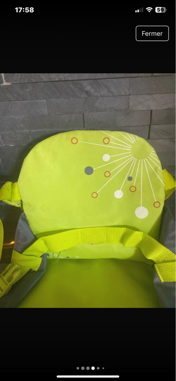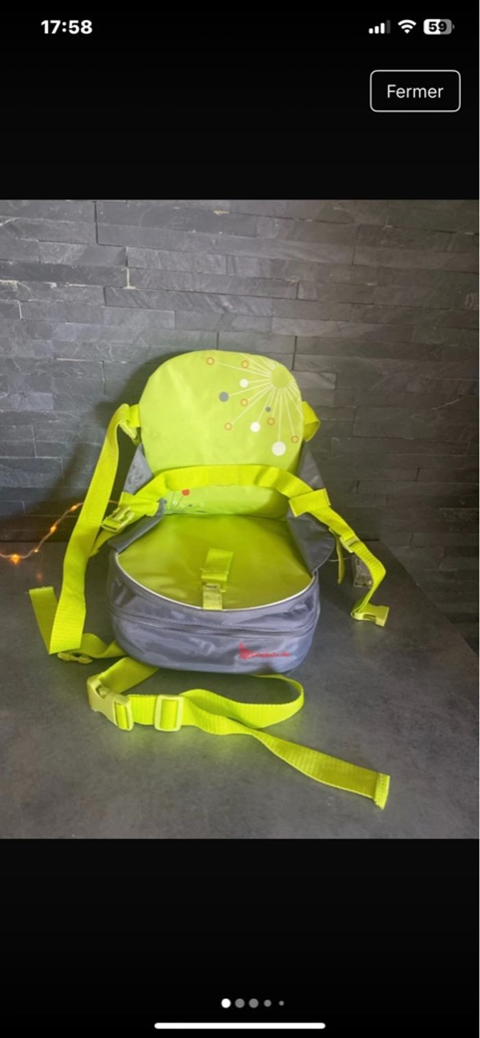 siège nomade Badabulle d'occasion bon etat toutefois petites taches car utilisé s'accroche sur la plupart des chaises facile à emporter se transforme en sac à dos. Pratique et sympa pour les vacances. Les enfants adorent cela !!