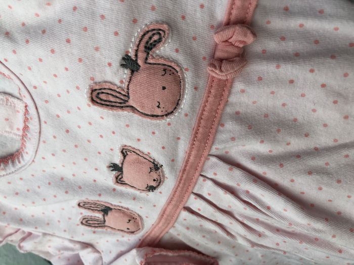 Pyjama une pièce, grenouillère, dors bien Kiabi, Taille 6 mois/ 63-69 cm, Mi-saison/ été. En coton rose pâle avec des petits points roses, motifs petits lapins et chat, Petits volants sur les épaules. Ouverture par pressions à l’arrière. En très bon état, sans trou ni tache. Non grisé. 🌸 Vous aimez cet article ? N’oubliez pas de visiter le reste de mon dressing en filtrant les tailles.