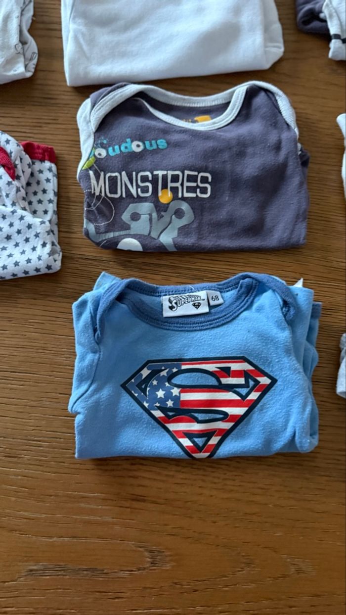 Lot de 11 bodies manches longues Taille 6 mois / 68 cm 1 body Mickey / Disney Baby 1 body Superman 1 body Absorba 2 bodies Tape à l’œil qui s’attachent devant (l’un est abîmé au niveau des boutons) Le reste est de diverses marques