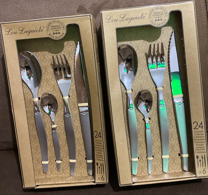 Vends set deux couverts 48 pièces 12 fourchettes, 12 couteaux de table, 12 petits cuillères, 12 cuillère à soupe en inox idéal pour cadeau offrir et pour la Noël ou pour anniversaire neuf dans l'emballage prix 65 € les 48 pièces ou bien un seul coffret, 24 pièces 35 € # couzon amefa pradel cuisine