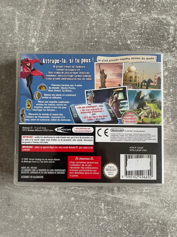Jeu pour Nintendo DS Mais où se cache Carmen Sandiego, mystère au bout du monde en français. Bon état. Livré avec sa boite et son manuel. Envoi rapide et soigné. Consultez mes autres articles pour de moindres frais de port.