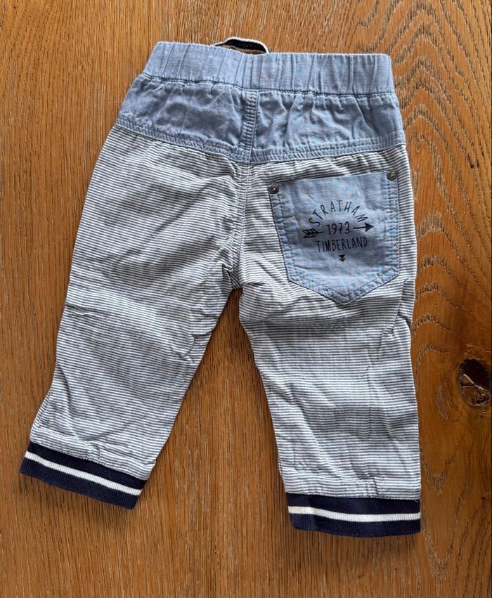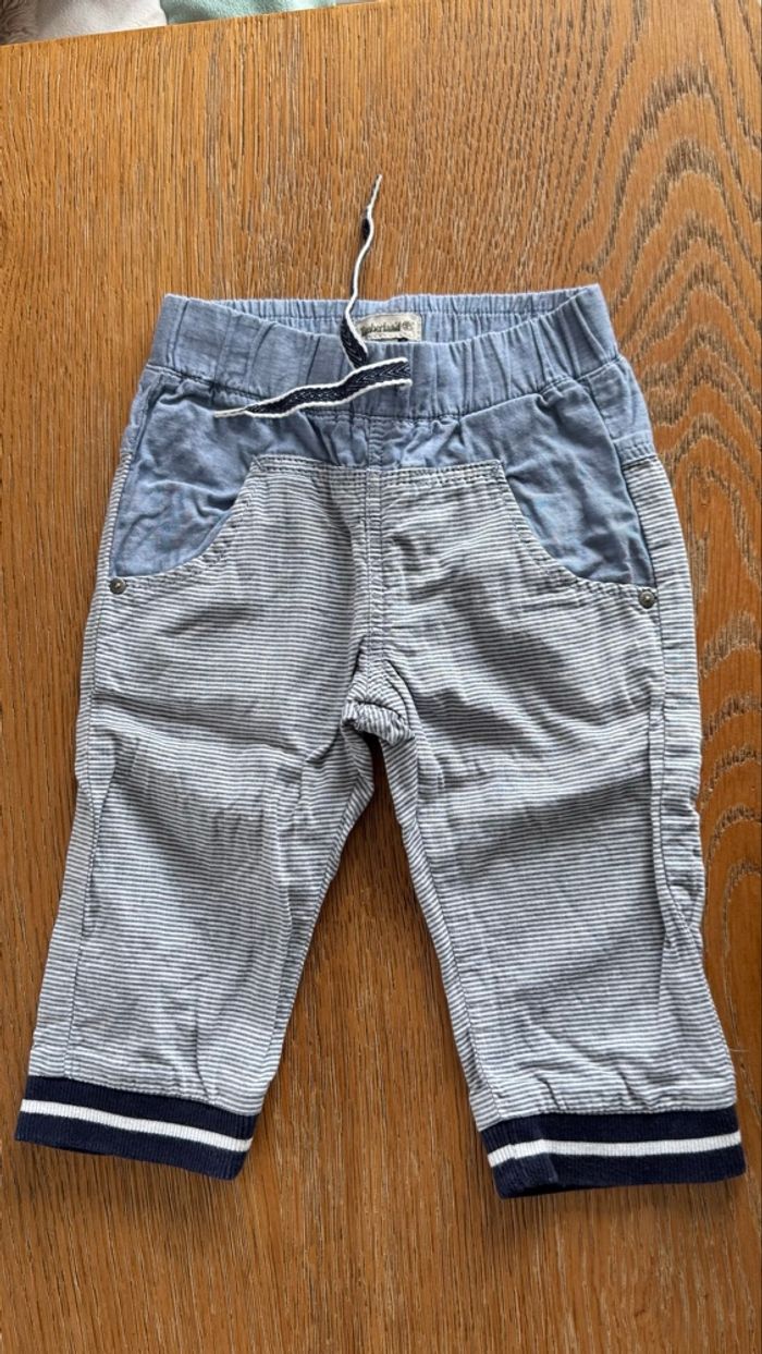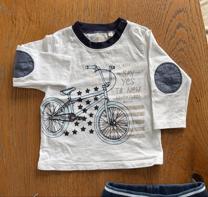 Un teeshirt manches longues avec détail aux coudes Un pantalon fin rayé avec détail sur la poche arrière Un pantalon style jean (mais il n’est pas en matière jean, il est souple donc plus pratique pour bébé) Les 3 sont de la marque TIMBERLAND. 12 mois / 74 cm