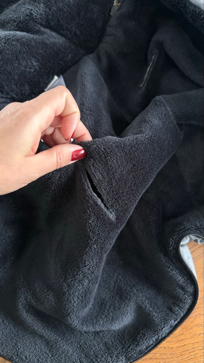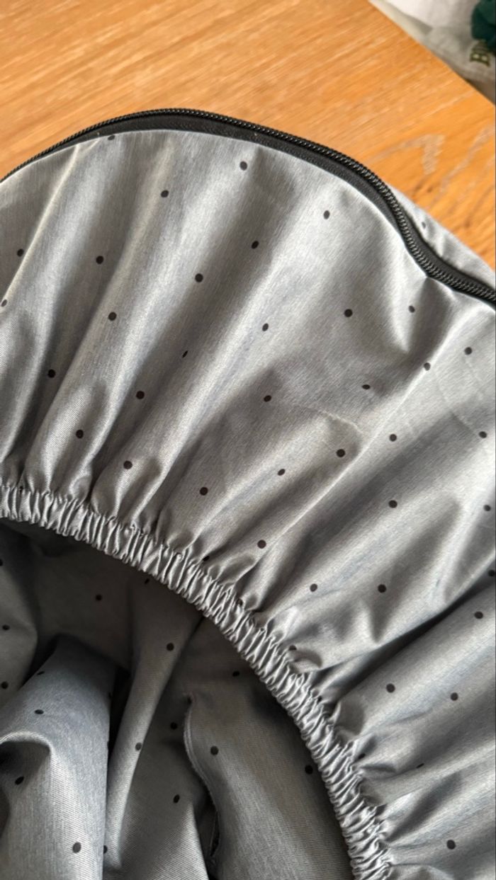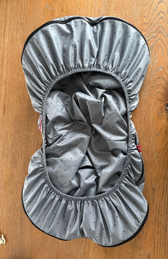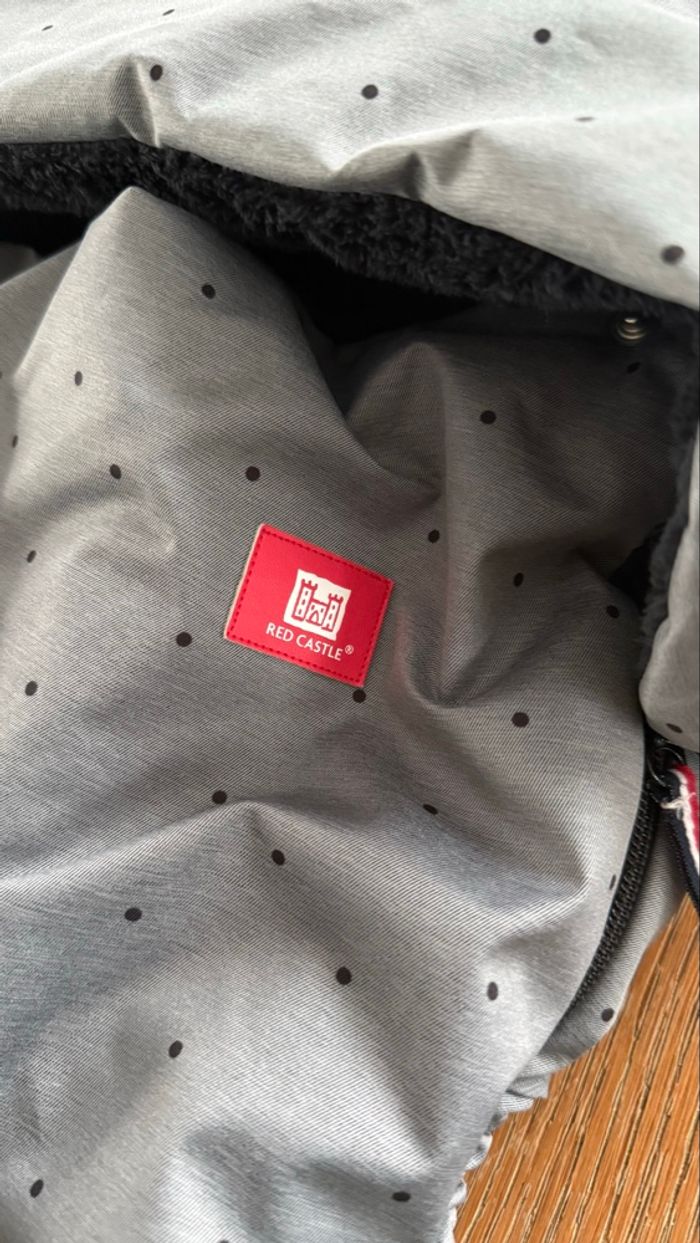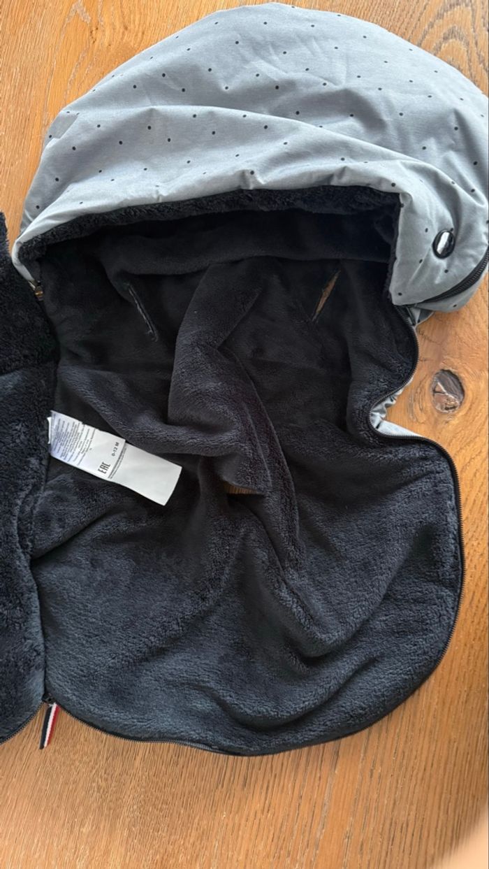 Chancelière bébé pour siège auto / cosy 0-12 mois Bien chaude Red Castle Gris chiné avec des points noirs, intérieur polaire noir Fermeture éclair sauf la capuche qui se ferme avec des boutons pression Valeur 80€ Coupe vent, imperméable
