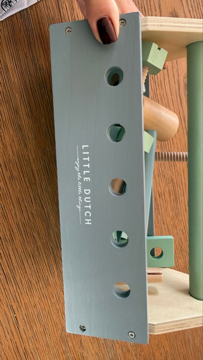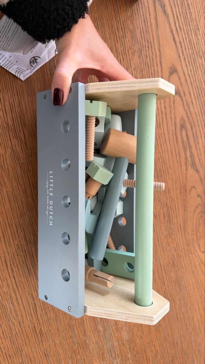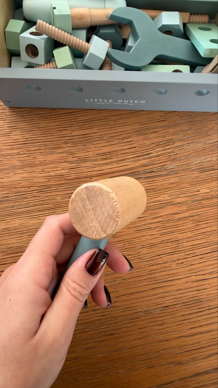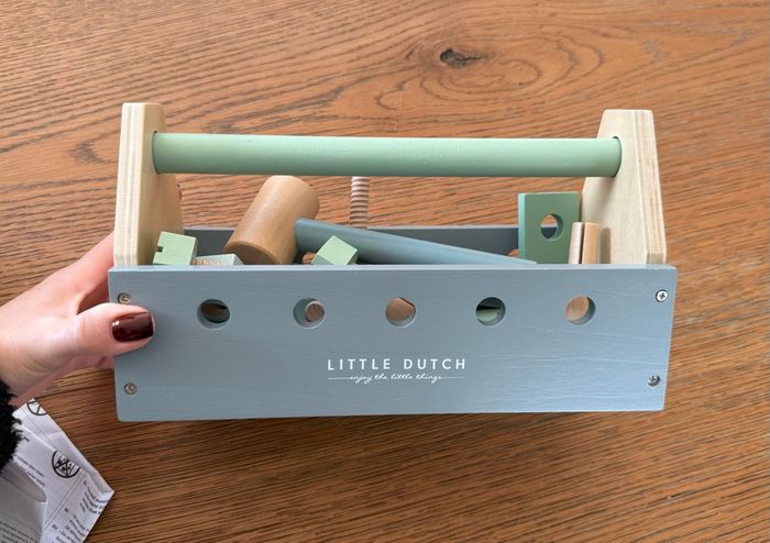 Boîte à outils en bois et outils en bois Marque : Little Dutch Une marteau présente des traces : voir dernière photo sinon le reste est en excellent état voire comme neuf
