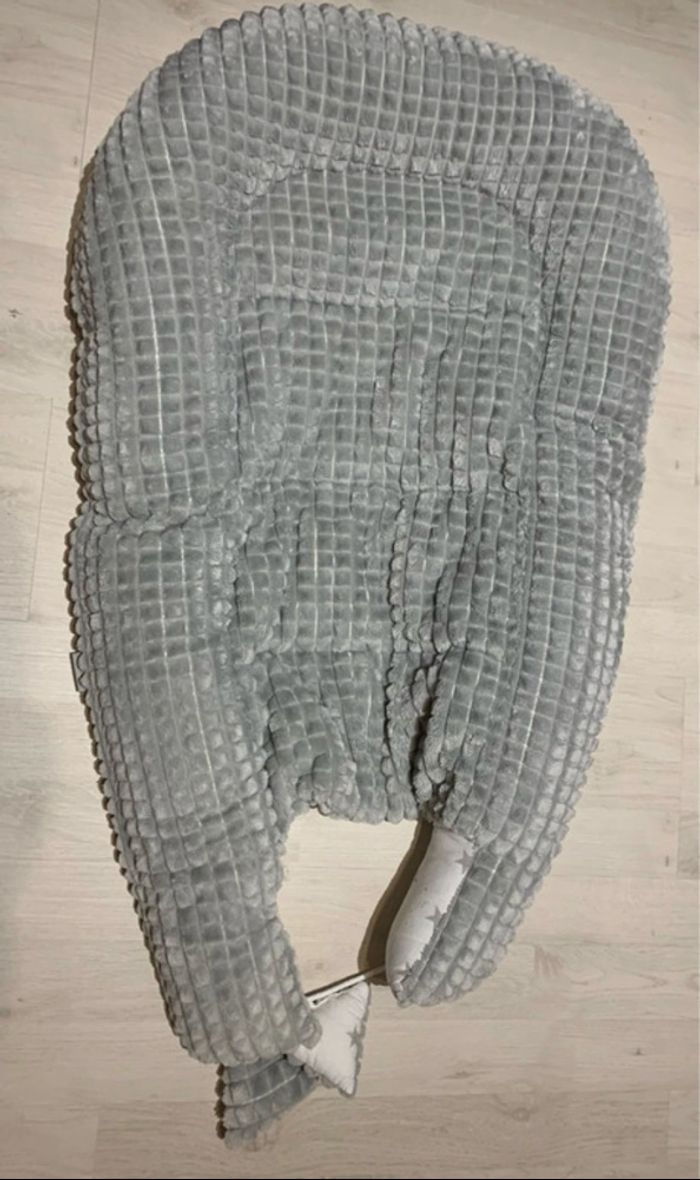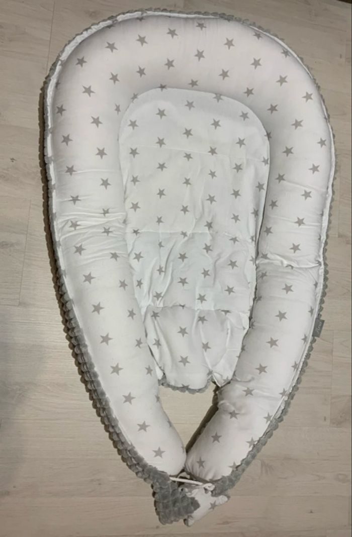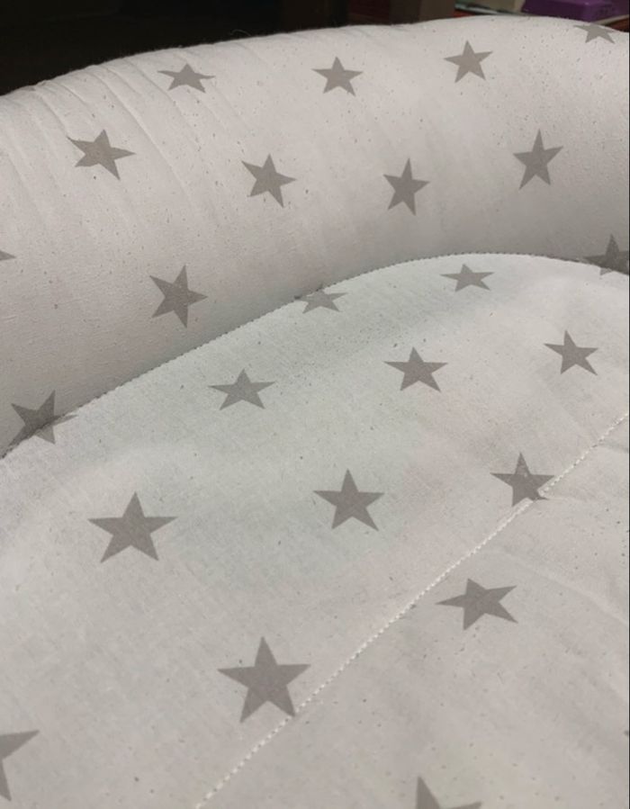 nid pour bébé , avec un motif d'étoiles grises. Conçu pour offrir un environnement douillet et sécurisant aux nouveau-nés, rappelant le ventre maternel. Idéal pour les bébés de la naissance jusqu'à environ 3 à 10 mois, selon les modèles. Peut être utilisé dans le lit parental, un parc, ou comme lit de voyage portable.