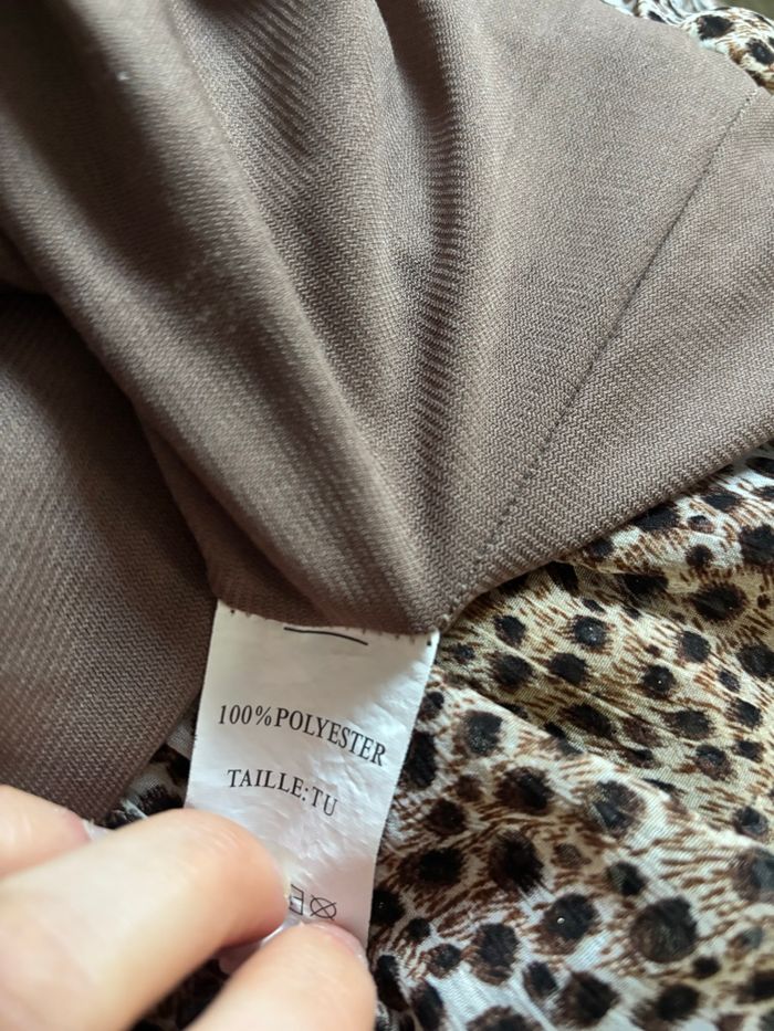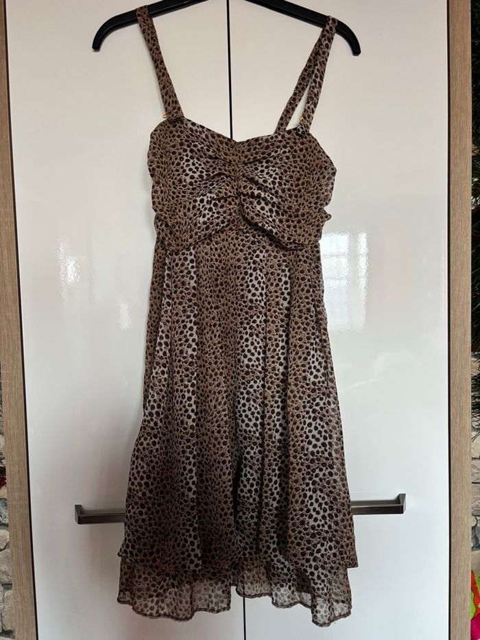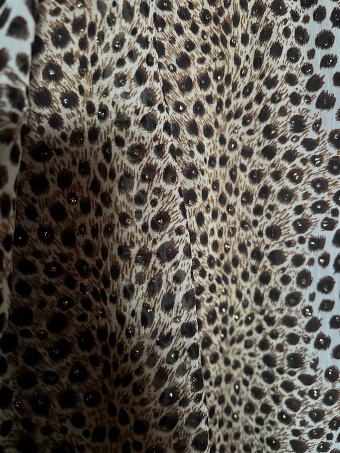 Très jolie robe à imprimé léopard, légère et fluide, parfaite pour une soirée, un événement ou l'été Le haut est joliment froncé au niveau de la poitrine, ce qui met la silhouette en valeur. Bretelles fines réglables avec détail doré (ce sont des épingles à nourrice). Tissu voile avec de petits détails brillants discrets qui apportent une touche élégante. Doublée, donc non transparente. Coupe évasée et longueur au-dessus du genou (selon la taille). État : Très bon état Taille : unique Couleur : Marron / beige / noir - imprimé léopard Matière : Tissu fluide type voile / mousseline Envoi rapide✨