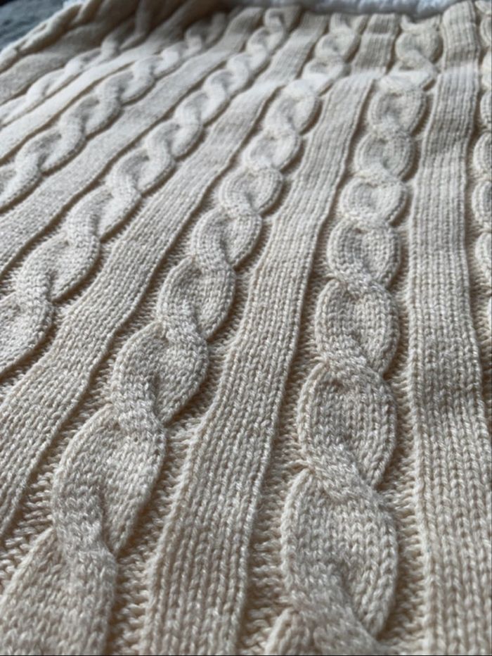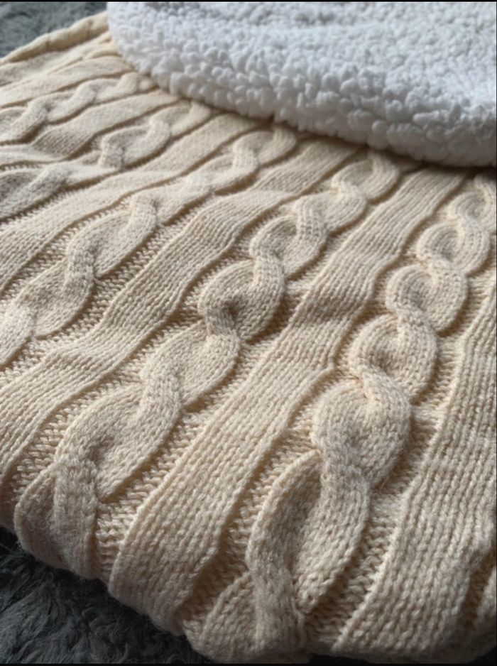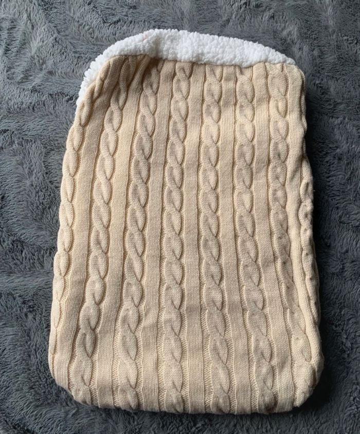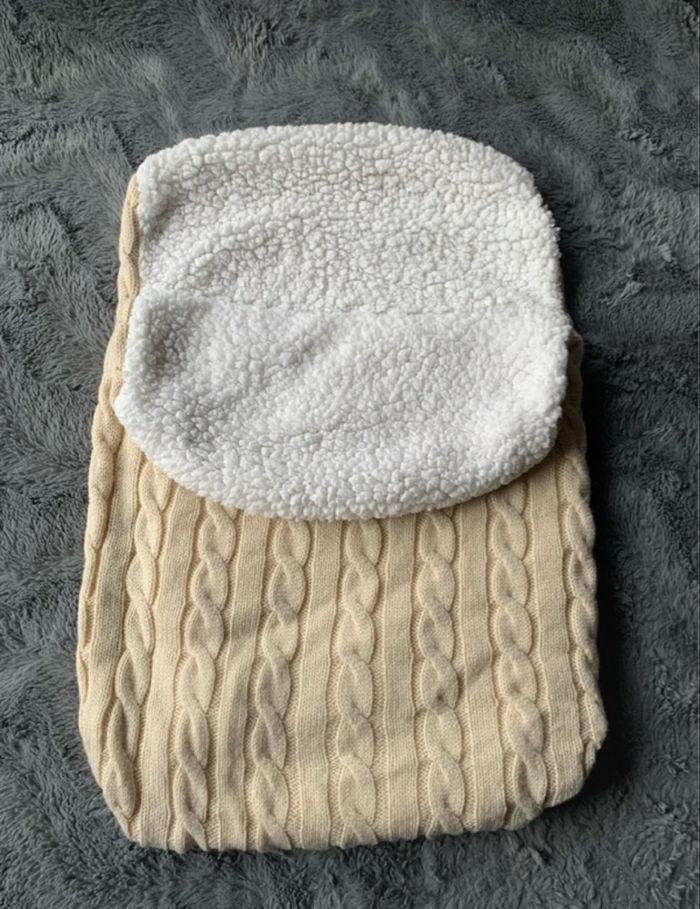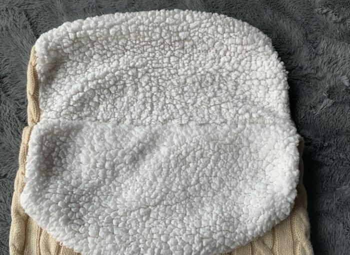 nid d'ange ou une chancelière pour bébé en tricot torsadé de couleur crème avec une doublure en sherpa blanche
