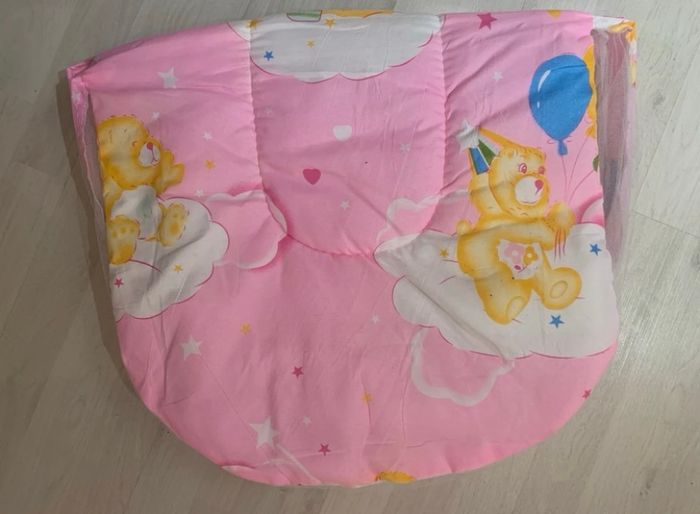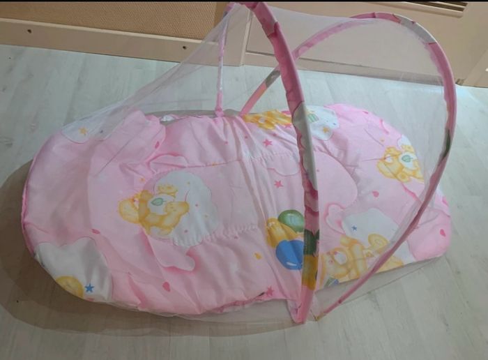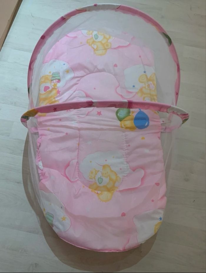 moustiquaire portable et pliable pour bébé. Elle est conçue pour protéger les nourrissons des moustiques et autres insectes. Le design pliable permet un rangement compact et un transport facile, idéal pour les voyages ou les activités de plein air. Elle est souvent livrée avec un tampon en coton ou un matelas fin intégré. Le modèle présenté est rose avec des motifs de dessin mignons.
