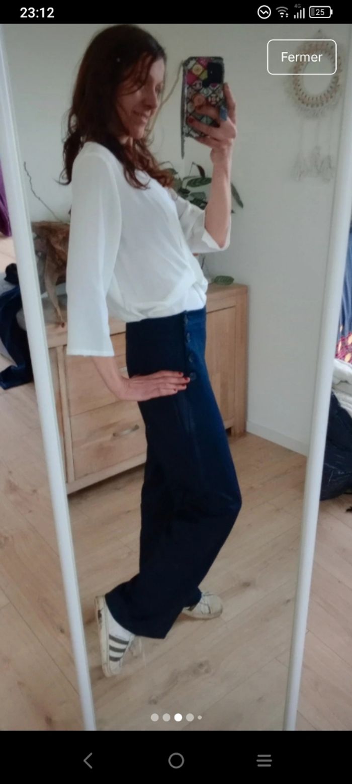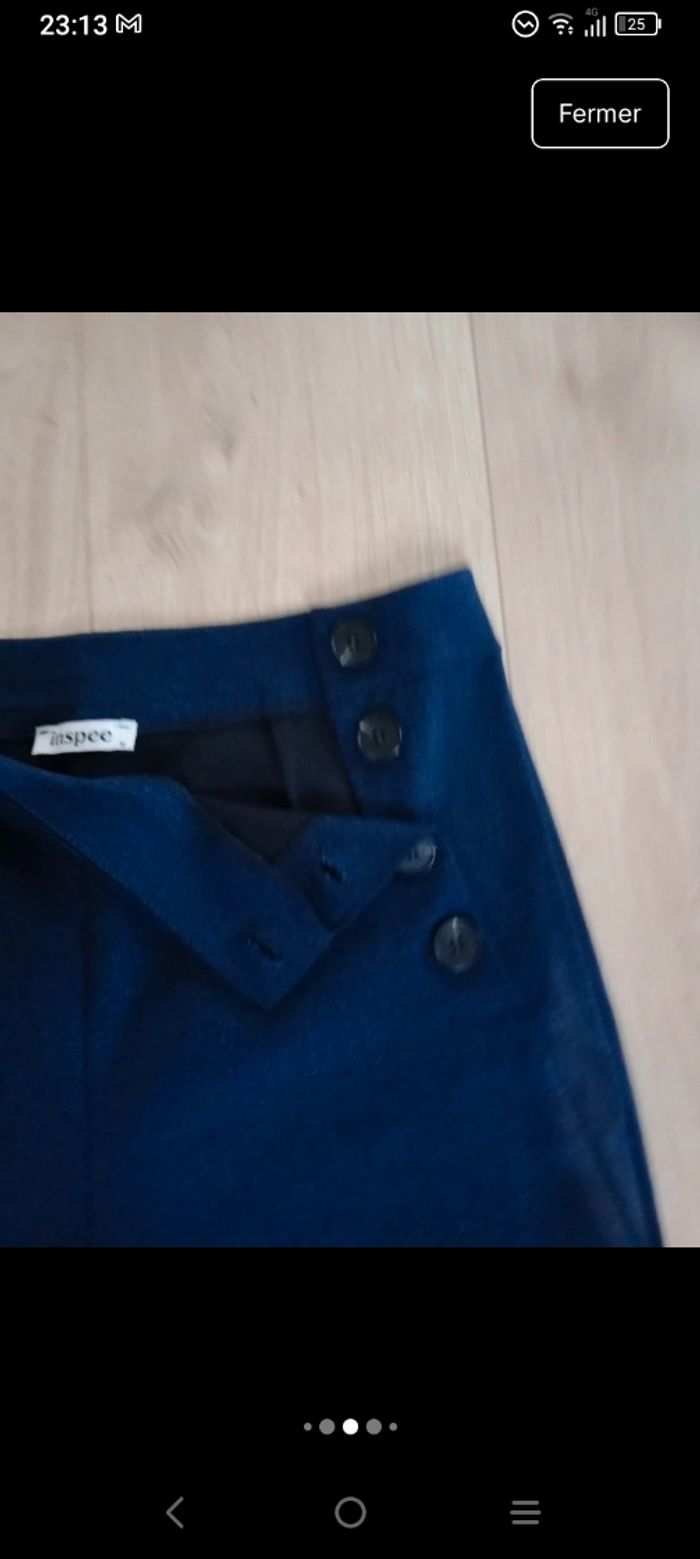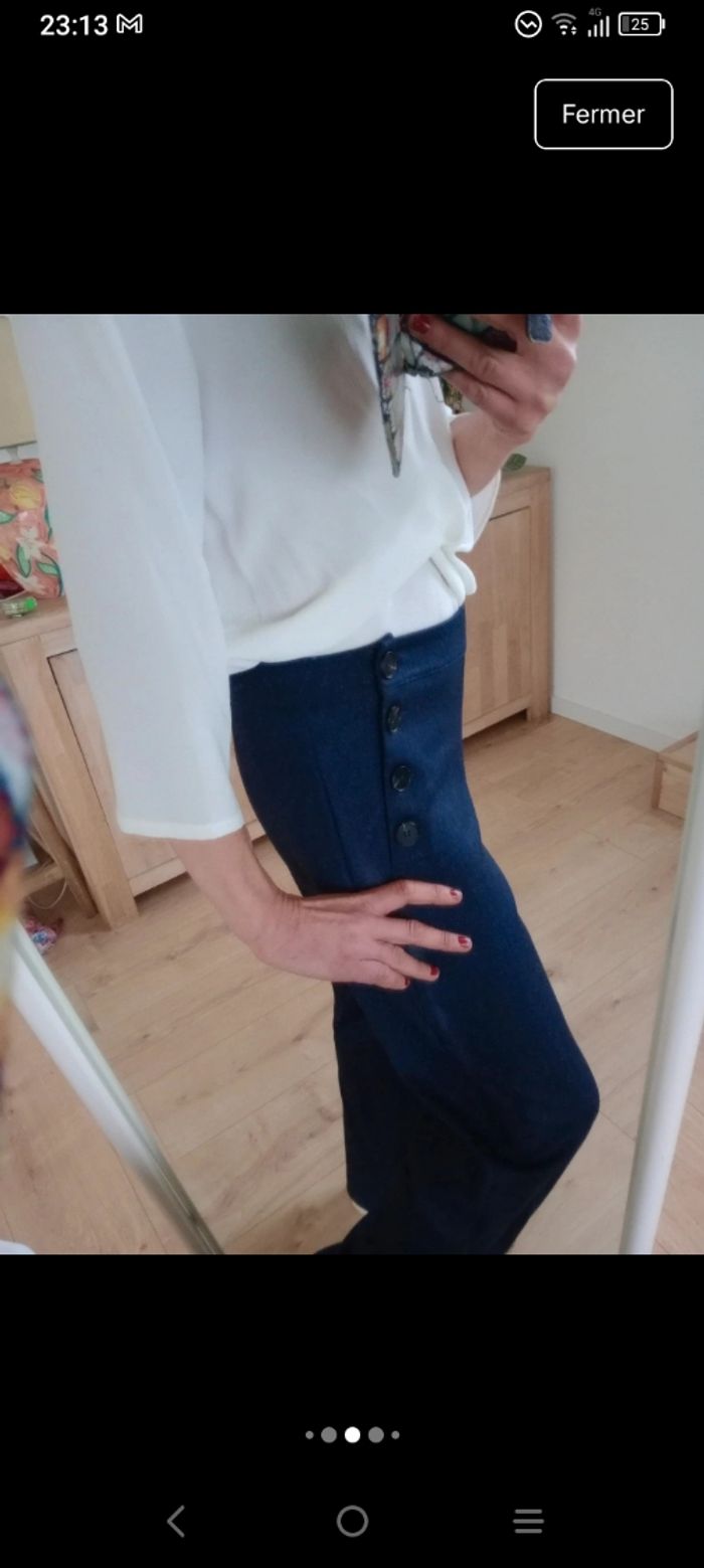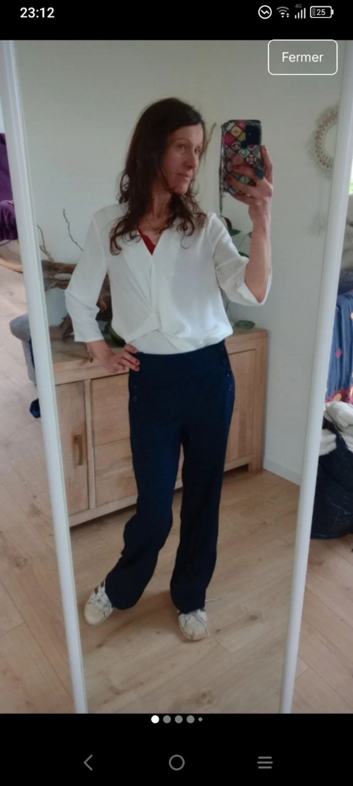Superbe pantalon🥰 bleu marine de la marque inspee. Très élégant avec sa coupe droite et son style "pont" caractérisé par ses boutons décoratifs sur les côtés de la taille💞 ​Marque : inspee ​Origine : Fabriqué en Italie ​Taille : M ​Couleur : Bleu marine profond ​Détails : Fermeture par boutons sur les côtés (style marin/pont) ​Composition : 56% Polyester, 40% Viscose, 4% Élasthanne (matière légèrement extensible et très confortable) Largeur 36 cm longueur 100cm Les deux dernières photos présentes une légère décoloration sur le côté gauche.. Certainement dû au soleil 😅 #calomomi_femme38 ​#pantalon #marine #stylemarin #pantalonpont #madeinitaly #inspee #tailleM #chic #modeitalienne #pantalonfemme