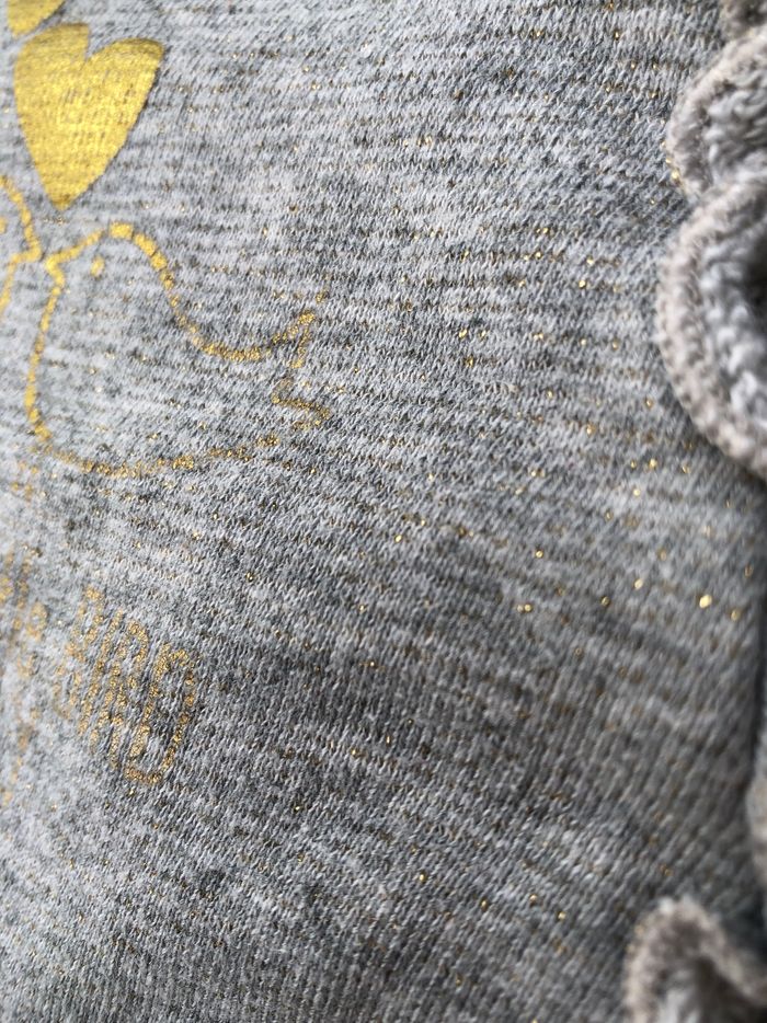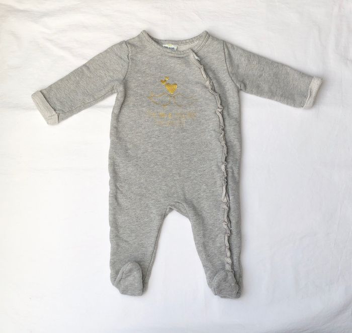Pyjama une pièce hiver, grenouillère, dors bien Tape à l’œil, Taille 6 mois/ 68 cm, En coton/ fibres métalliques. En matière « sweat » grise avec de fines rayures discrètement dorées. Motifs deux oiseaux sous des cœurs, Volant tout le long de l’ouverture. Ouverture par pression sur tout l’avant. En très bon état, sans trou ni tache. A noter qu’un oiseau et la phrase en dessous sont en train de s’effacer. Cf photos. 🌸 Vous aimez cet article ? N’oubliez pas de visiter le reste de mon dressing en filtrant les tailles.