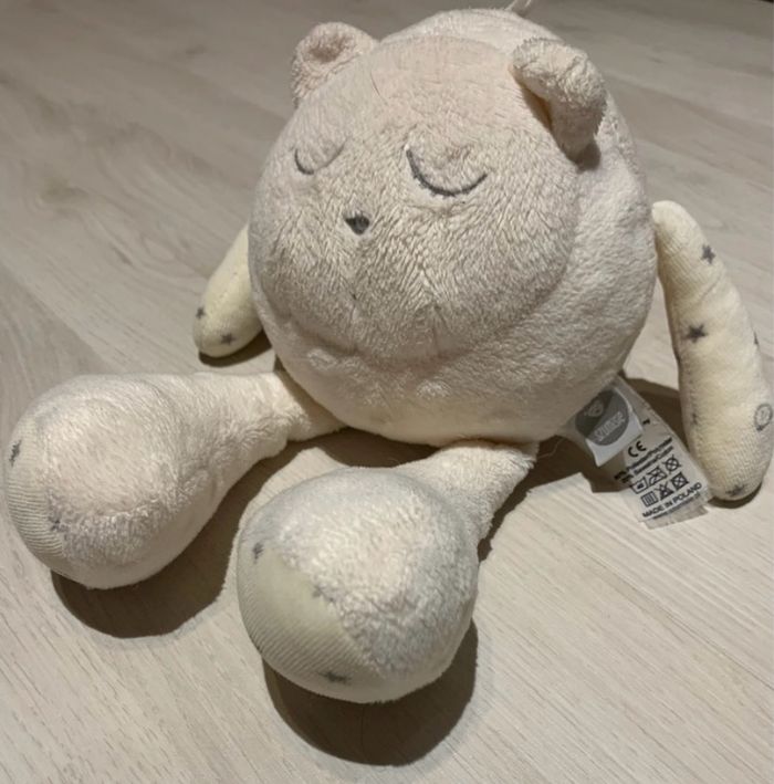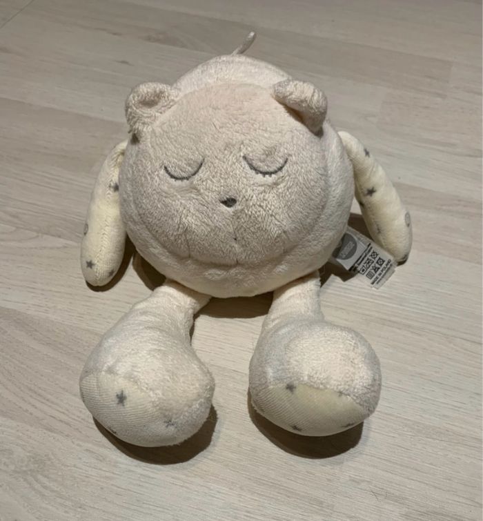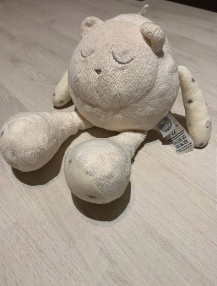 Cette peluche douce émet des bruits blancs pour aider les bébés à s'endormir. Bruit du coeur Bruit de l'aspirateur Bruit tracteur Le tissu stimule les sens de bébé.