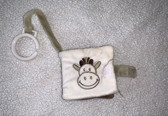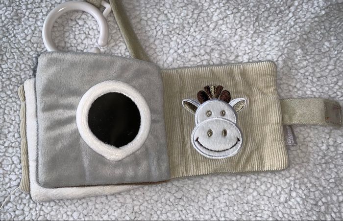 livre d'activités en tissu pour bébés, souvent appelé cube ou livre d'éveil, de la marque Tiamo. Conçu pour développer la coordination œil-main, la motricité fine et les sens de bébé. Comprend un miroir pour que bébé puisse voir son reflet. Fabriqué à partir de matériaux doux et texturés, comme du velours côtelé et du tissu pelucheux. Dispose d'une sangle de suspension pour l'attacher facilement à une poussette ou un lit.