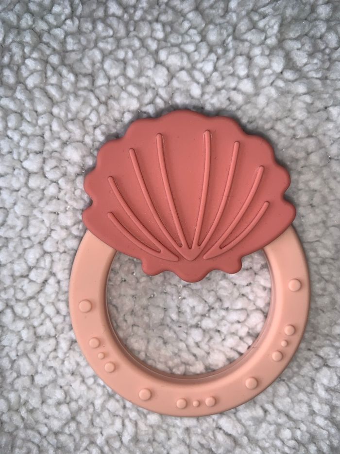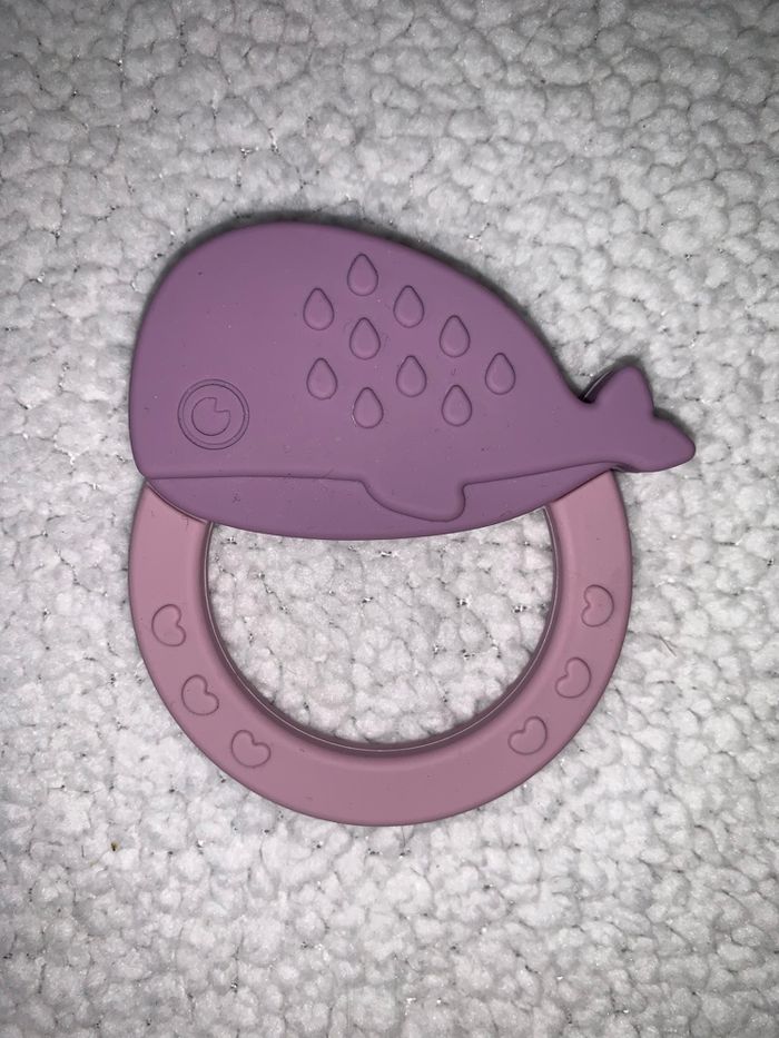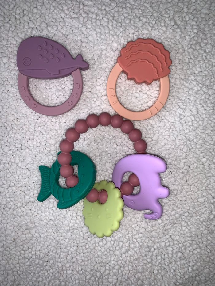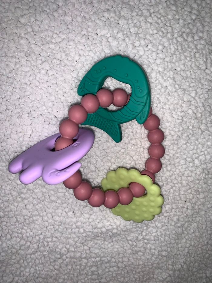 Anneau mordeur baleine violet : Forme amusante de baleine avec texture pour masser les gencives. Anneau mordeur coquille rouge : Design texturé en forme de coquille pour stimuler les sens. Bracelet/anneau éléphant violet avec perles marron : Bracelet flexible avec éléphant, poisson vert et textures variées ; sert aussi de hochet. Bracelet perles avec anneau : Perles silicone vertes et roses pour une prise facile par les petites mains.