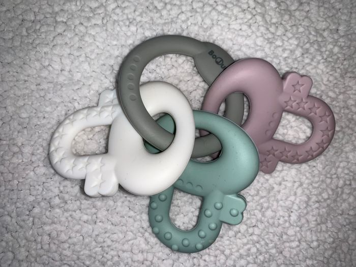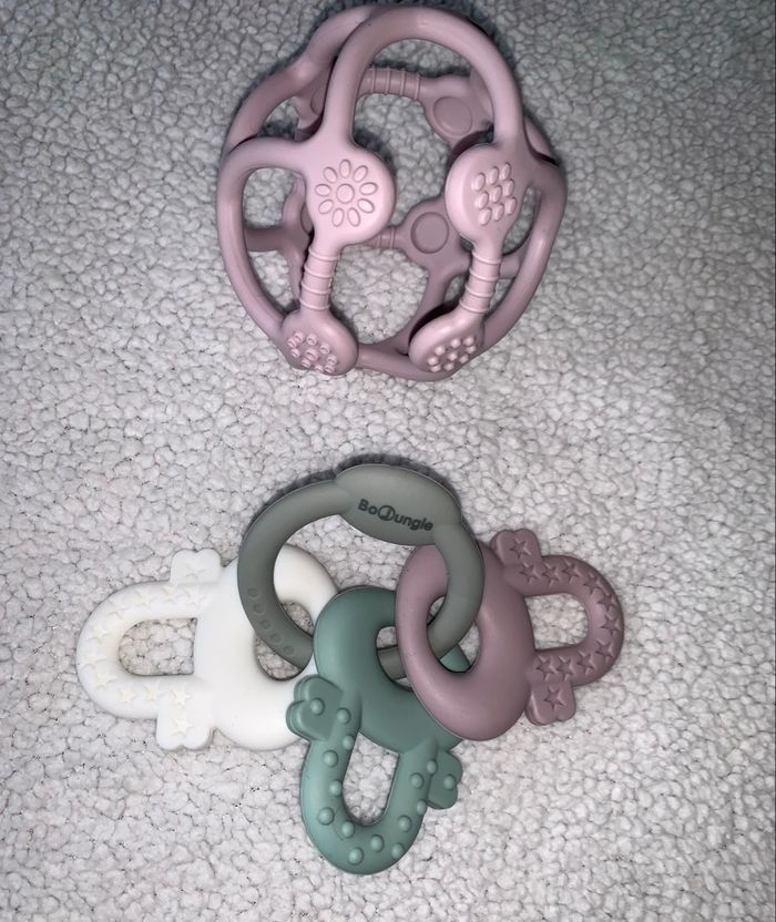 La balle rose et l'anneau gris sont tous deux de la marque Bo Jungle, parfaits vendus ensemble pour la dentition de bébé. Balle B-Ball rose : Textures variées pour masser gencives, facile à saisir (~10 cm), dès la naissance. Anneau gris : Multisensoriel avec logo Bo Jungle, idéal poussées dentaires.