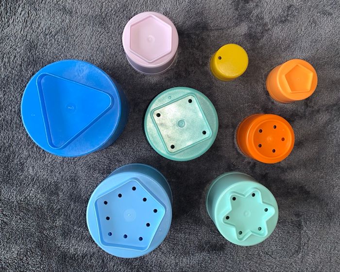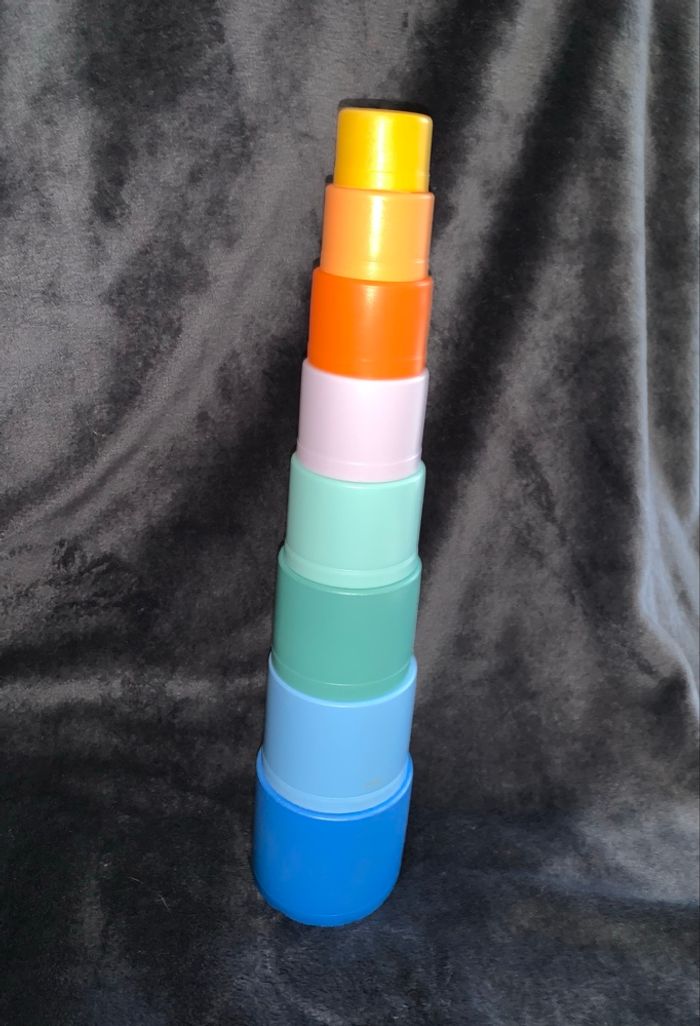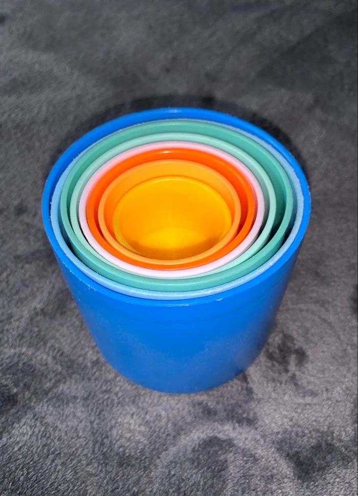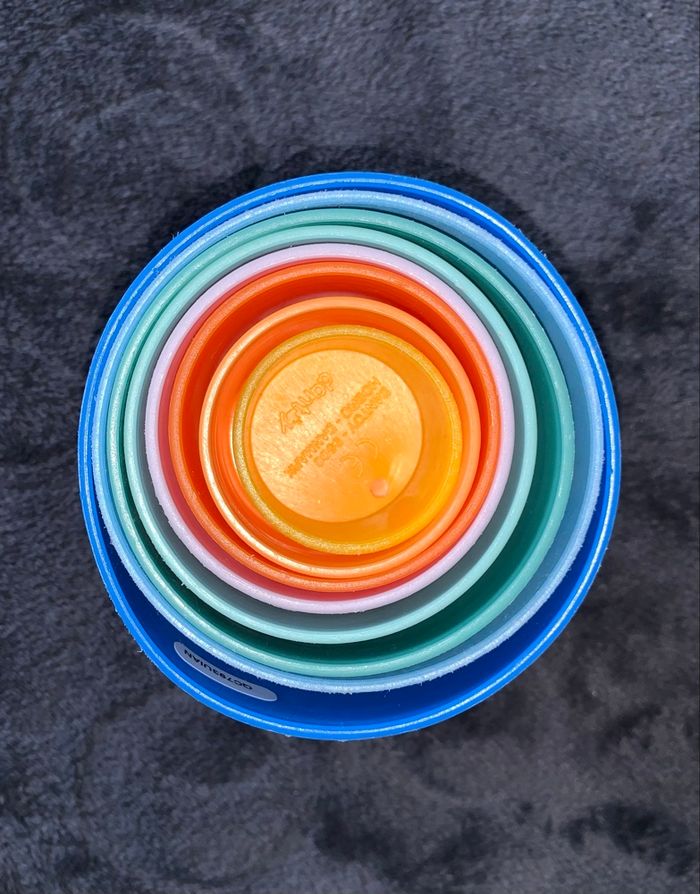 Superbe set de 8 gobelets empilables en couleurs pastel (jaune, orange, rose, vert clair, vert, bleu clair, bleu foncé). Parfait pour développer la motricité fine, la coordination et la reconnaissance des couleurs chez les bébés dès 6-12 mois. Idéal pour jouer seul ou en famille, en empilant ou pour le bain. État impeccable, jamais utilisé en bain, propre et sans défauts