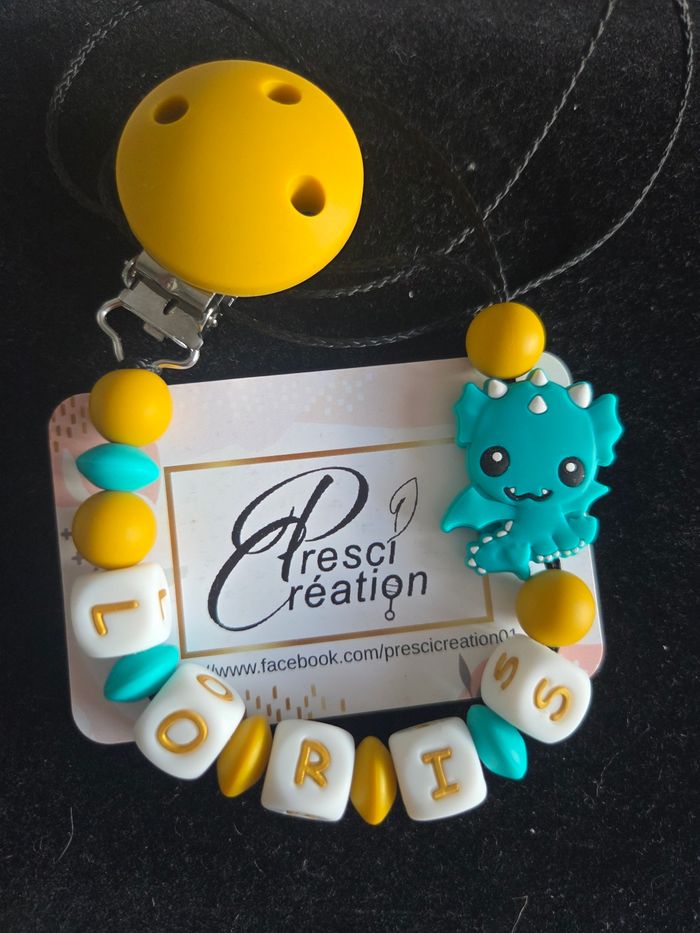 Attache tétine silicone dragon 🌟Fil doublé 🌟Nœud de sécurité et nœud anti coulissement 🌟Taille respecter de 22 cm Thème au choix Possibilité de prénom en fluo dans la nuit pour un supplément me contactez Me contactez